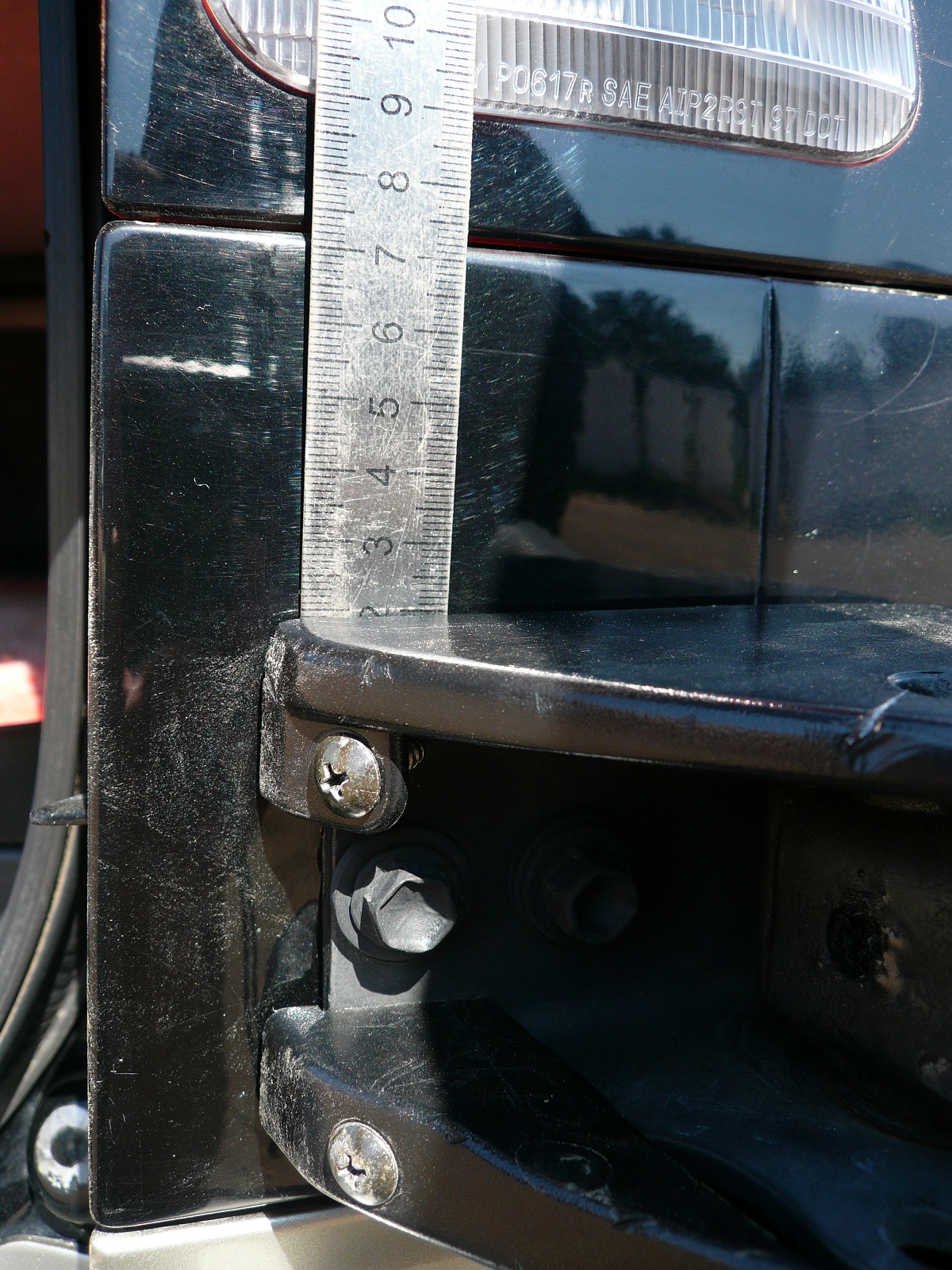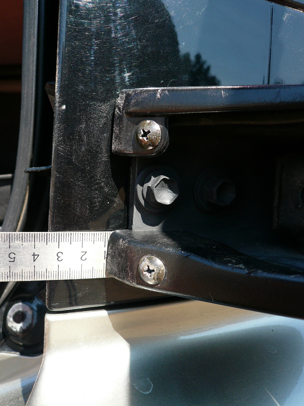 Петля MB537399 -416р. Уплотнитель(шайба) MB927187 -405р. видел бы в глаза сделал бы сам После началась подгонка и установка кронштейна MR241831. Подгонял его ровно понижнему срезу на шесть болтов и немного сварки. После чего всё собираем из выше заказанного, и начинаем подгонять калитку на крыле. Защёлкиваем калитку в замок на петлю и прикладываем к крылу.У меня получилось после тщательной подгонки с такими замерами по нижнему крепежу После выравнивания нижнего прижмёте верхний крепёж и отметите отверстие. Напоминаю калитка должна быть при этом защёлкнута в замке. У меня не было этих размеров поэтому подгонял долго прежде чем решился просверлить.