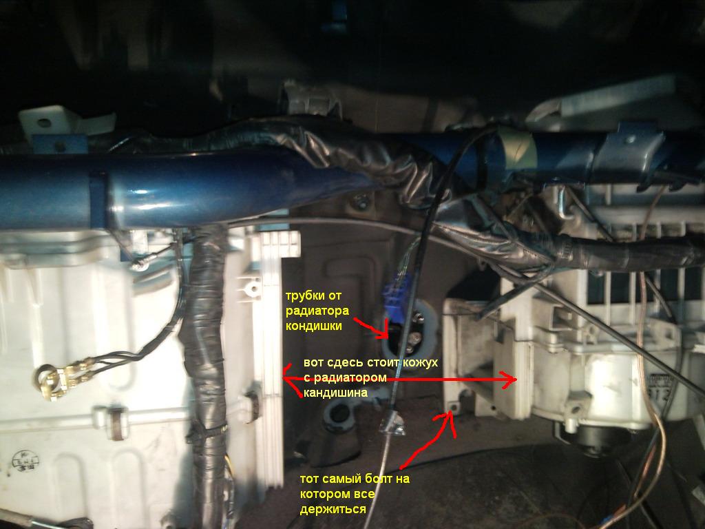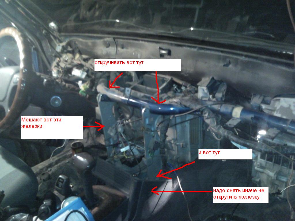 2я фаза ремонта объединила в себе проблему 1и2 пришлось снимать торпеду а также все пластмаски которые вокруг рычага передач так как чтобы вытащить ту часть печки в которой стоит радиатор отопления они очень мешают, потомучто ее надо вытягивать на себя а в них он упираеться! как только достали радиатор надо слить с него весь антифриз и попробывать в него дунуть воздух должен проходить без усилия ! я ради интереса взял с собой его и паехал в магазин попросил дать мне дунуть в новый и попробывал дунуть в свой !!! разница оказалась большая пришлось пакупать !