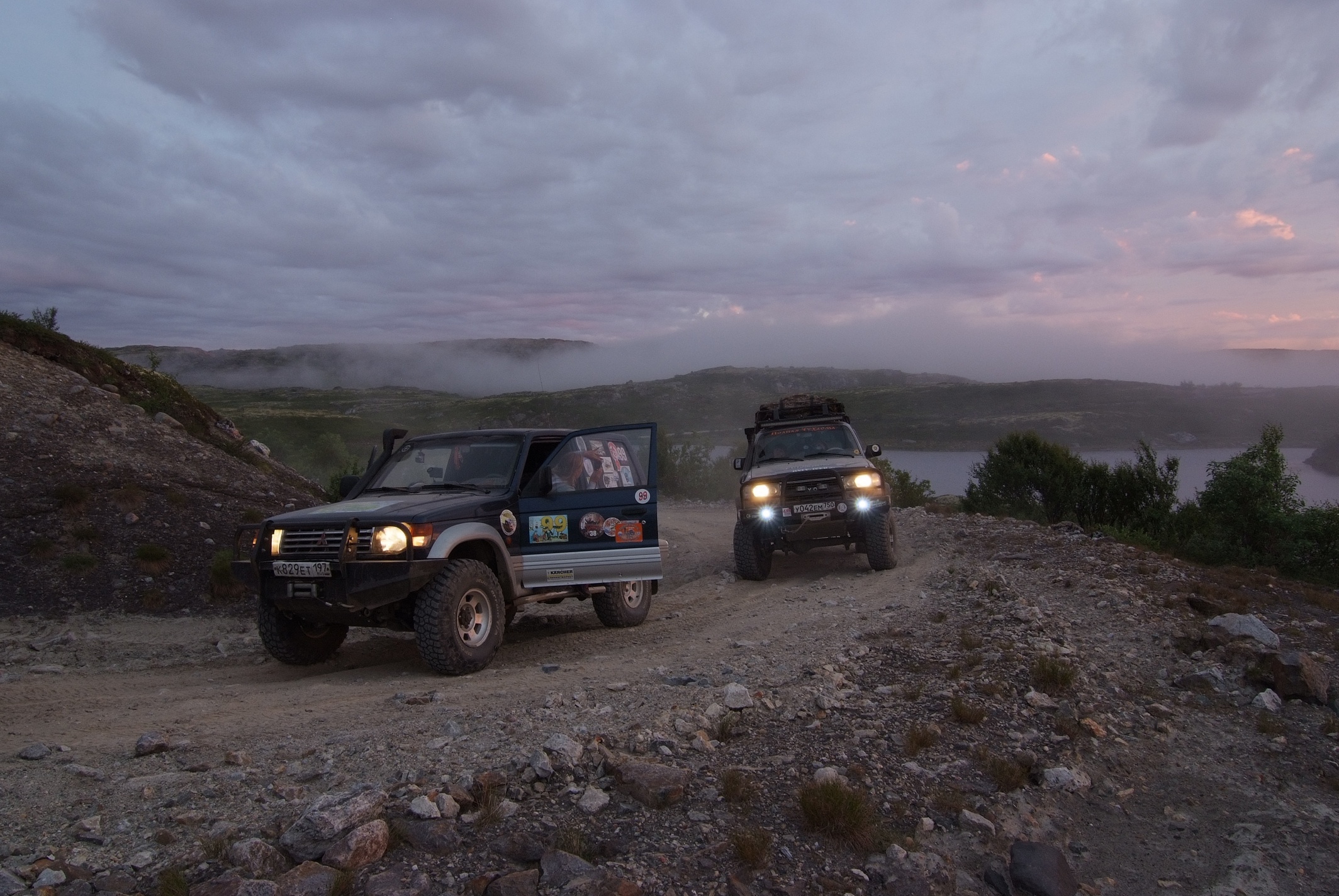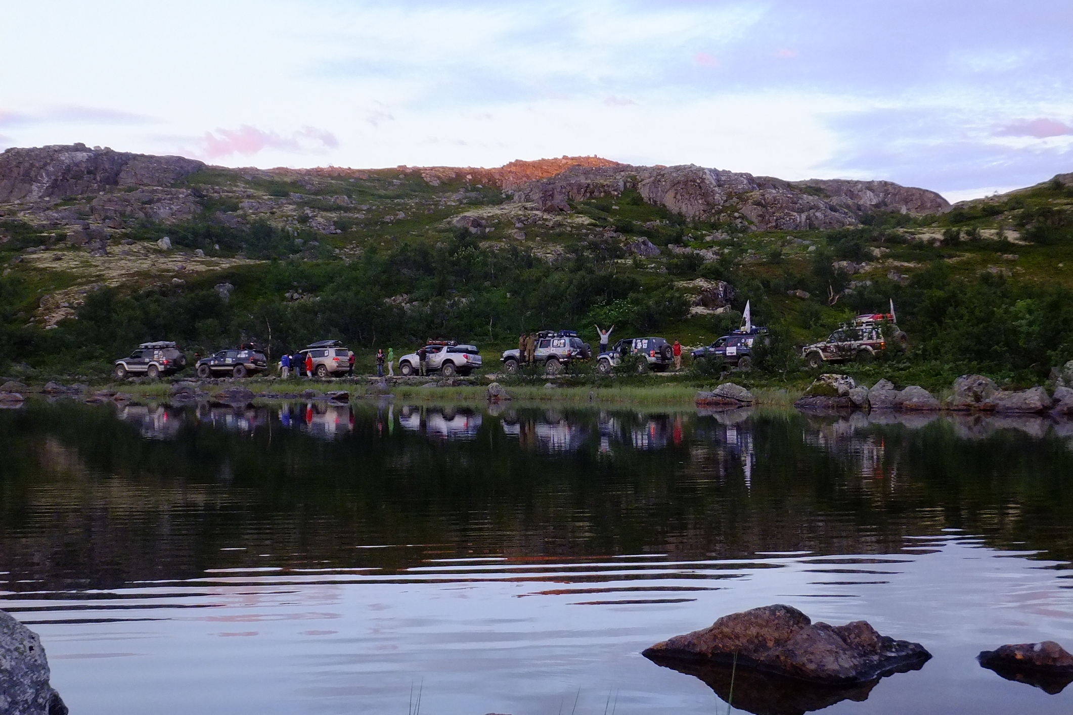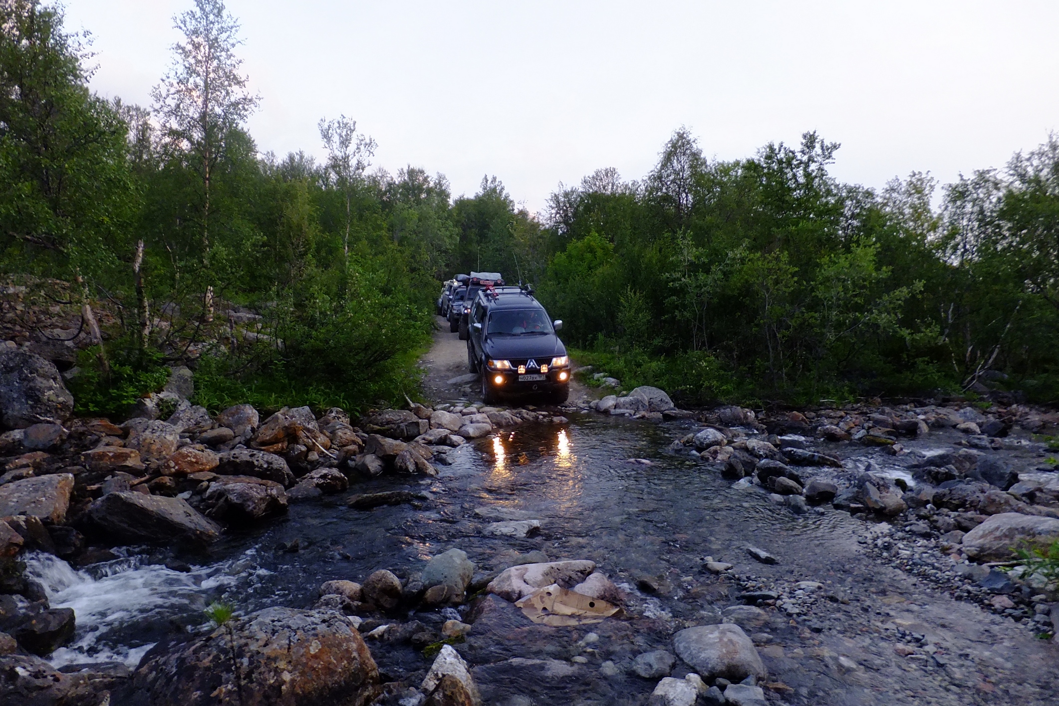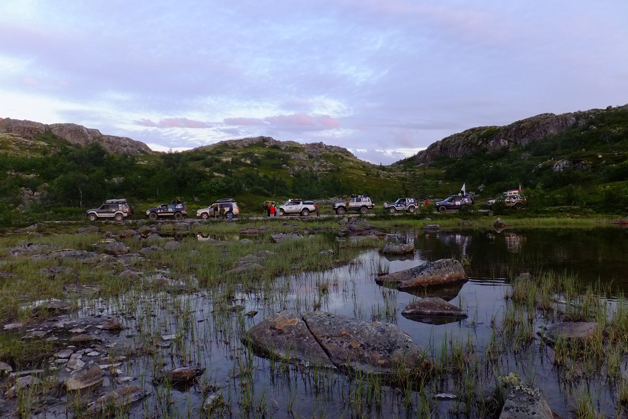 КОгда мы пересекли ворота полигона я не думал ни о Печенгском заливе, ни о зеленке ни о старой немецкой дороге.. я всматривался в каждый поворот и ждал когда за ним откроется чудо, ну как минимум то чудо о котором нам рассказывал "вежливый зеленый человек". И да, брод оказался не то что ручьем, а так.. лужицей. А за ним был еще, но по виду более респектабельный. Если первый был просто лужей с грязными берегами, то второй это уже прям настоящая горная река! .. Зелебоба прошел ее довольно бодро! дальше дорога была такой красочной что я язык даже проглотил, ну в переносном смысле слава богу.. не то что бы трясло и я им поперхнулся, просто обилие цветов вперемешку с пылью давало такую картинку, что стоило не ехать а идти и фотографировать каждый метр, а то и сантиметр. Почти случайно остановились у интересного озера, вид на нашу колонну со стороны открывался поразительный.. взял пару фотиков и побежал.. прям как знал что еще пригодится. ..
