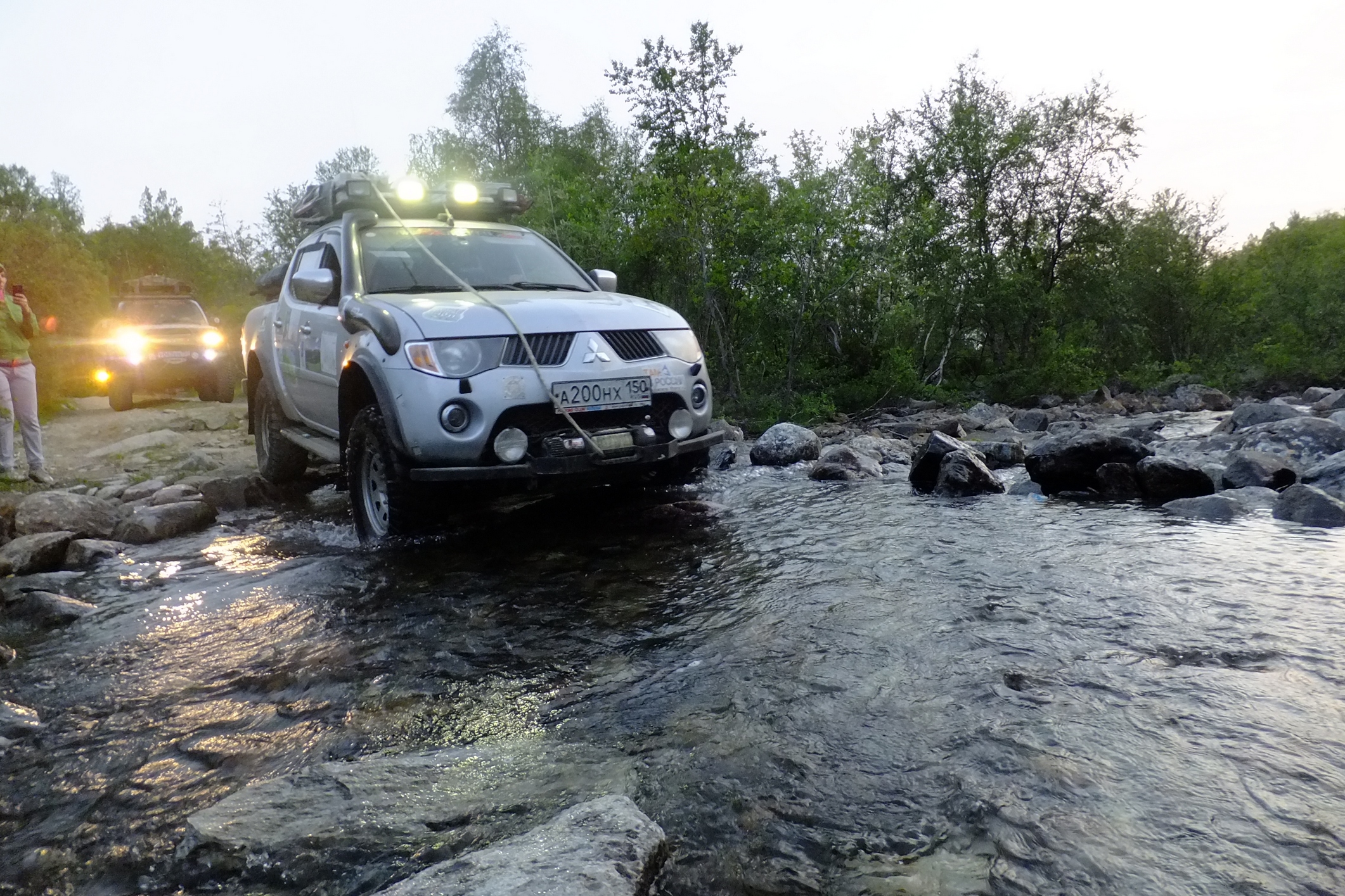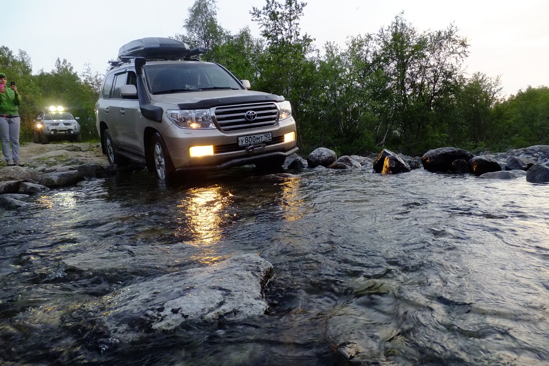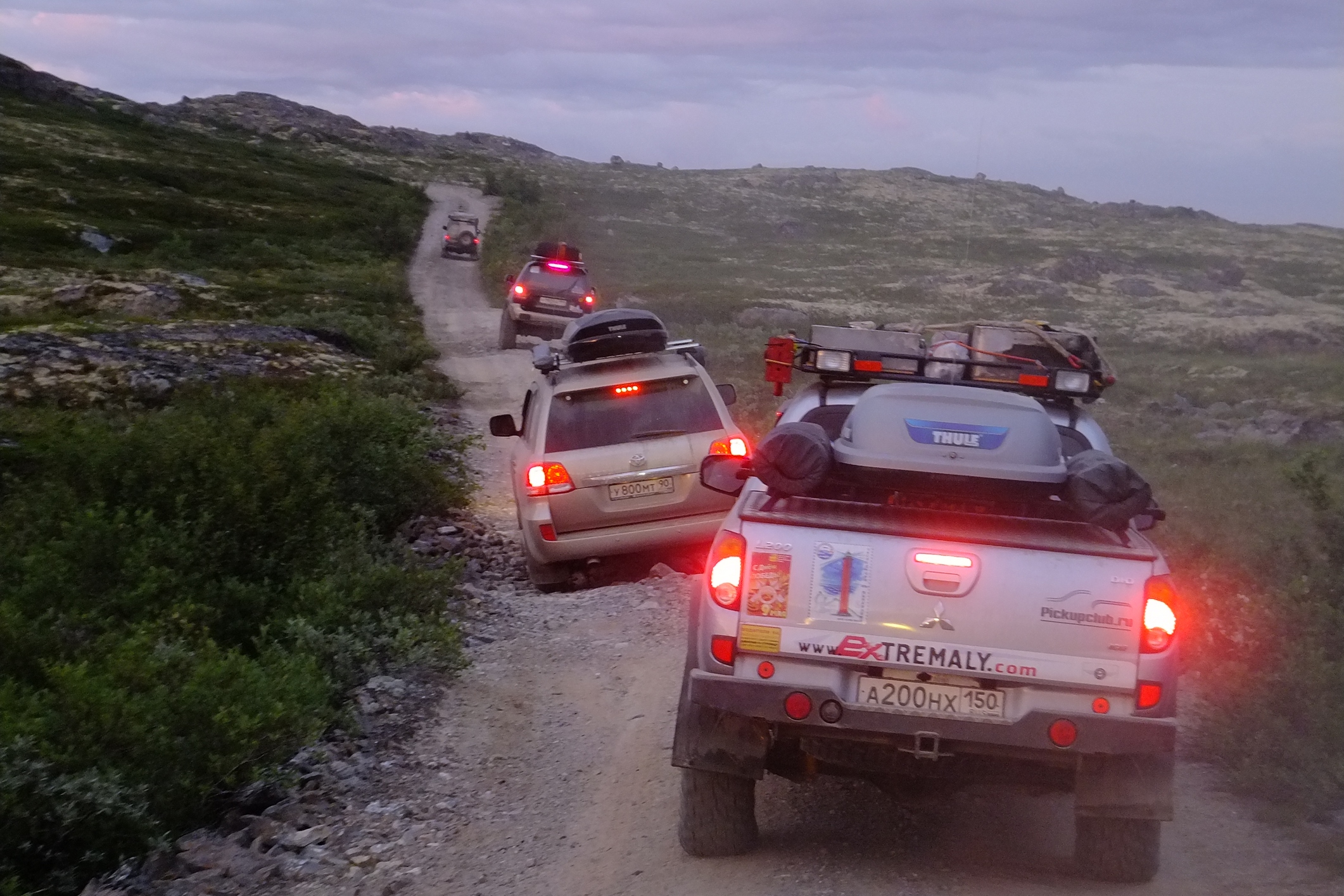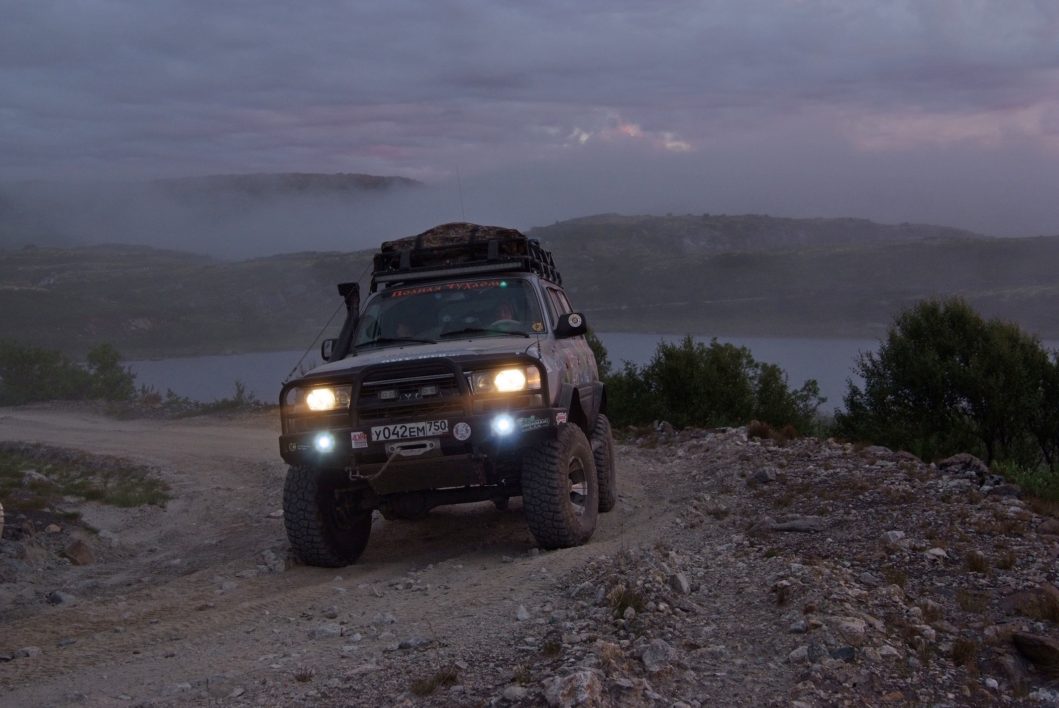 КОгда мы пересекли ворота полигона я не думал ни о Печенгском заливе, ни о зеленке ни о старой немецкой дороге.. я всматривался в каждый поворот и ждал когда за ним откроется чудо, ну как минимум то чудо о котором нам рассказывал "вежливый зеленый человек". И да, брод оказался не то что ручьем, а так.. лужицей. А за ним был еще, но по виду более респектабельный. Если первый был просто лужей с грязными берегами, то второй это уже прям настоящая горная река! .. Зелебоба прошел ее довольно бодро! дальше дорога была такой красочной что я язык даже проглотил, ну в переносном смысле слава богу.. не то что бы трясло и я им поперхнулся, просто обилие цветов вперемешку с пылью давало такую картинку, что стоило не ехать а идти и фотографировать каждый метр, а то и сантиметр. Почти случайно остановились у интересного озера, вид на нашу колонну со стороны открывался поразительный.. взял пару фотиков и побежал.. прям как знал что еще пригодится. ..