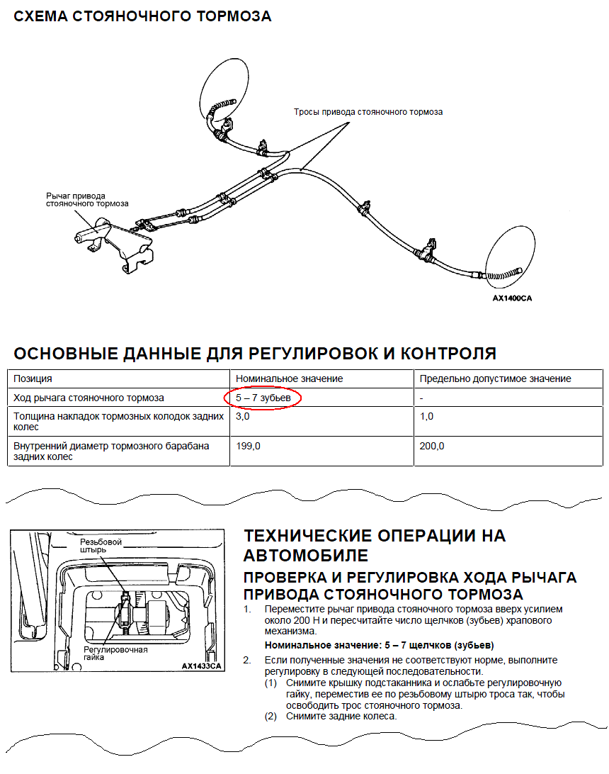 в идеале ручник должен схватывать с 1-2 щелчка, а когда опускаешь ручку - никогда в жизни не зацепить колодками барабаны. там еще у рукоятки хода пипец сколько, пока она до первого щелчка дойдет.