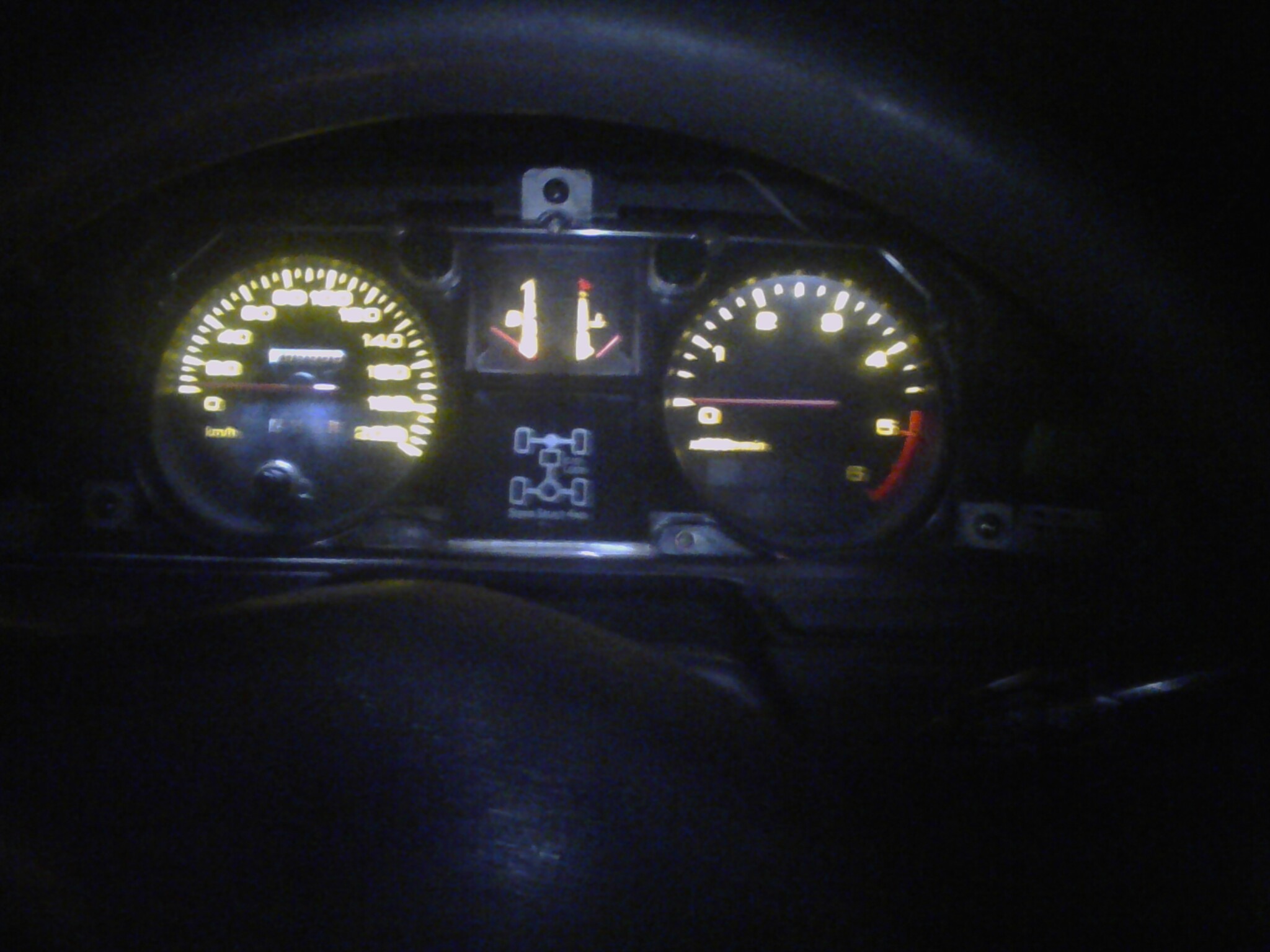Колеса не горят потому что машина не заведена, а вот в кренометре я еще ленту светодиодную не установил. Зато теперь с этой лентой все приборы читаются отлично, правда охота белое свечение. В будущем буду рассматривать приобретение панели от рестайла (вроде они идентичны, только светофильтр желтый отсутствует)