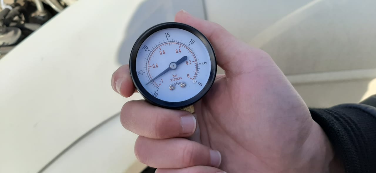 Как уже писал выше, свист при стоячей машине при нажатии педали газа не слышен. Посмотрел за штоком привода управления геометрией лопаток на горячей стороне турбины. Визуально вроде открывается. Решил помочь отверткой - https://youtu.be/ls77T-wEwN4 и о чудо ... при нажатии отверткой оказывается можно переместить шток на 2мм до своего упорного винта, и как раз при этом и раздается характерный свист. Причём когда свиста нет, то патрубки в от турбины можно спокойно продавить руками, давление во впускном коллекторе при этом составляет 16.5 psi/ А когда свистит при нажиме на шток, давление заметно возрастает до 19.4 psi, и продавить их тяжело. Да на всякий случай измерил давление в вакуумной системе манометром. Оно составило -0.96 Бар. Вполне себе нормально я считаю.