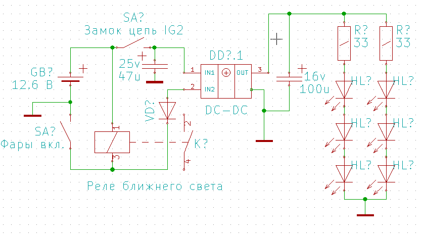 Блок работы ДХО это да. ДХО как доп оборудование со своим блоком, а штатное оборудование: подсветка номера, габариты, фары включены в любом случае, подсветка салона тоже. Тут если на светодиоды переводить, лучше сделать стабилизаторы, которые выдерживает такие броски, чем переделывать половину проводки авто, что бы оно все отключалось на время запуска.