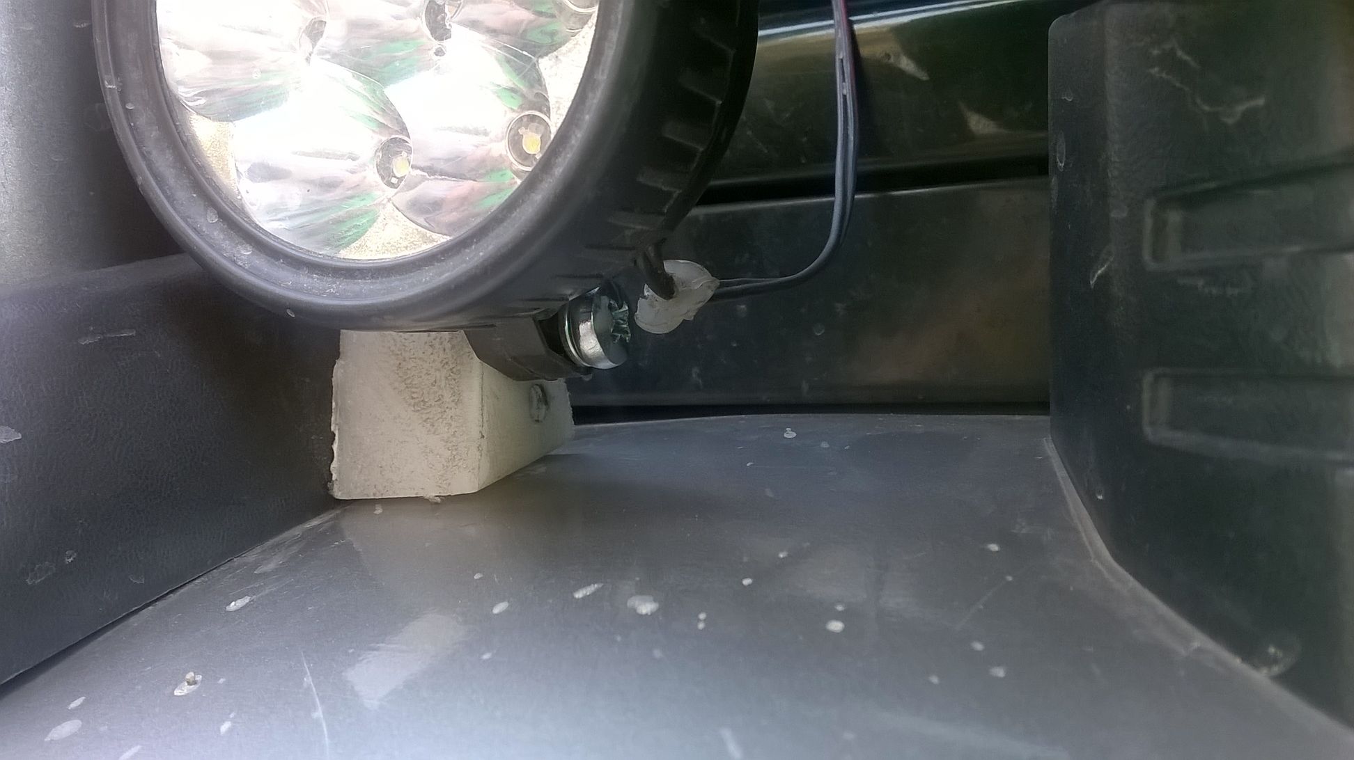 Долго думал куда и как, в результате прикрутил изнутри опор дуги болтами кусочки полиэтилена через отверстия под клипсы (самая муторная часть, если закручивать болты не снимая дуги). К таким вот "проставкам" прикручены фонарики. Полиэтилен достаточно мягкий материал и резьбы под болты не надо, достаточно отверстий 4,8-5мм для М5 4. Монтаж и проводка