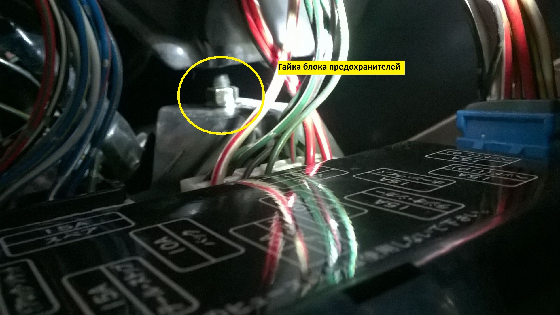 В салон пропущен через резинку тросика спидометра, там же неподалеку на жгуте проводки хомутом держится преобразователь. Для подключения к проводке надо снять подрулевой щиток и открутить блок предохранителей. Болт видно хорошо, а гайка справа и вверх.