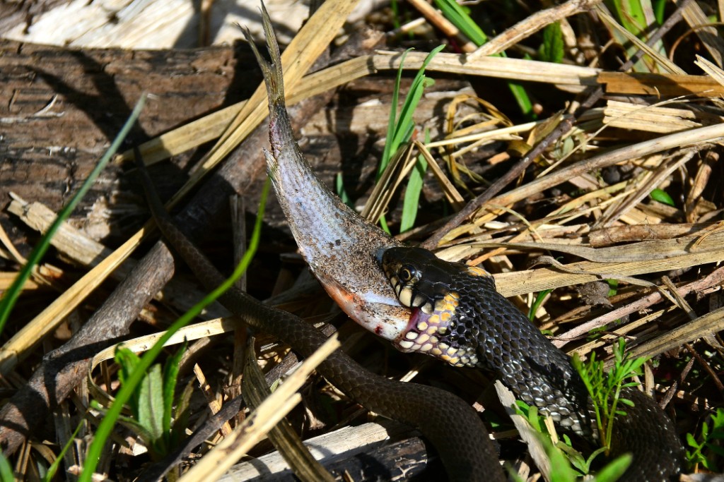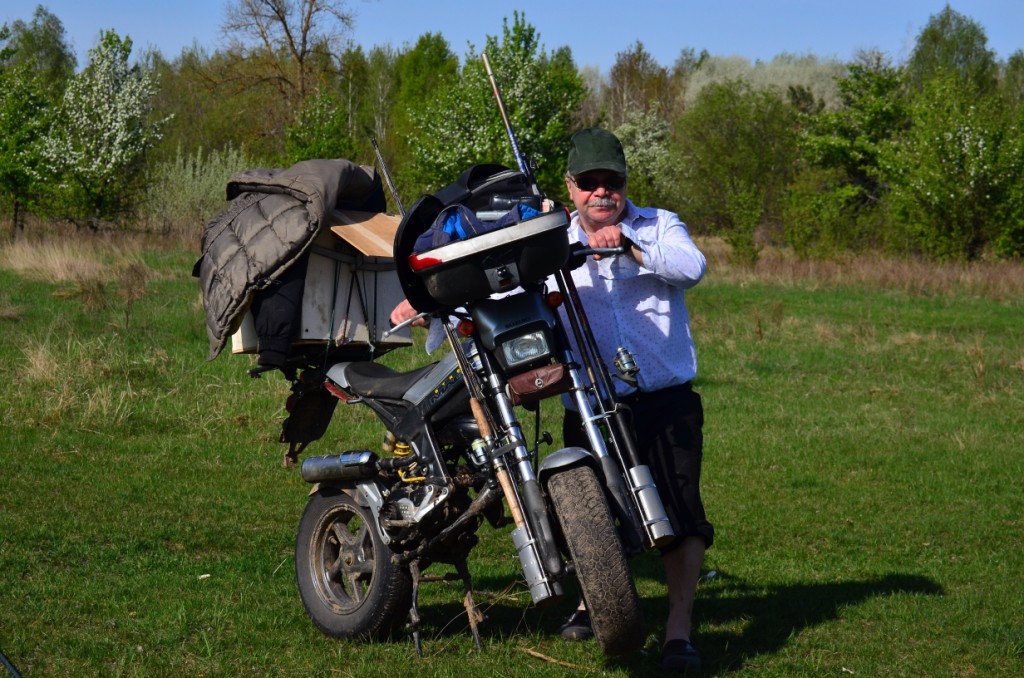 нашел фото интересного случая. поехал на скутере (на авто не проехать, на фото скутер мой, но не я с ним)) на удочку . ловилось неважно, одна устерка выпала из мешочка -я сразу не заметил. потом смотрю - онап лежит в стороне, а к ней ползет уж. я не стал его пугать, а взял фот и подождал, что будет. уж пытался проглотить устерку- так неспеша натягивал свой рот на нее. я не стал отбирать у него рыбу, не доглотав до конца он с ней уполз. наснимал я его много, вот одно из фот