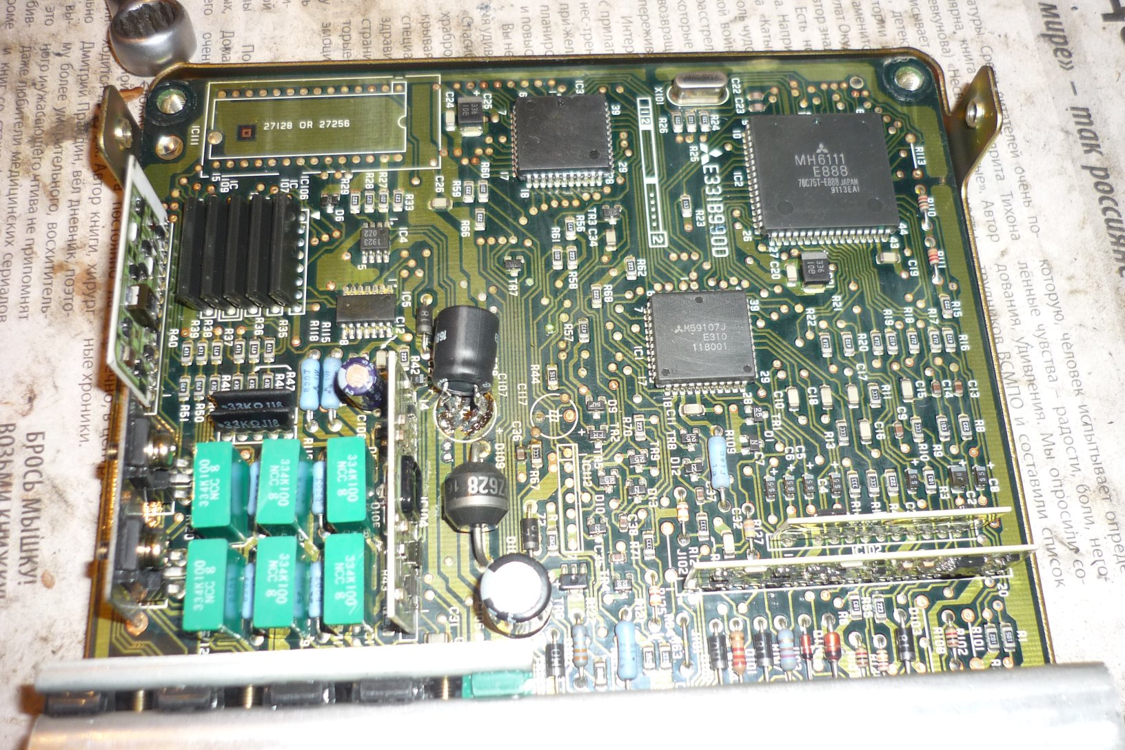 По поводу "Чека", в общем поменяли все кондеры, восстановили дорожки проводками, но "Чек" все равно не загорается. Все дорожки прозваниваются, все норм. Прозвонил от контакта 64 по всей плате, тоже все норм, может какой-то из резисторов???(больше нечему), их я не менял. Грешу на тот который голубой с оранжевыми полосками(на первых 2 фото его видно).
