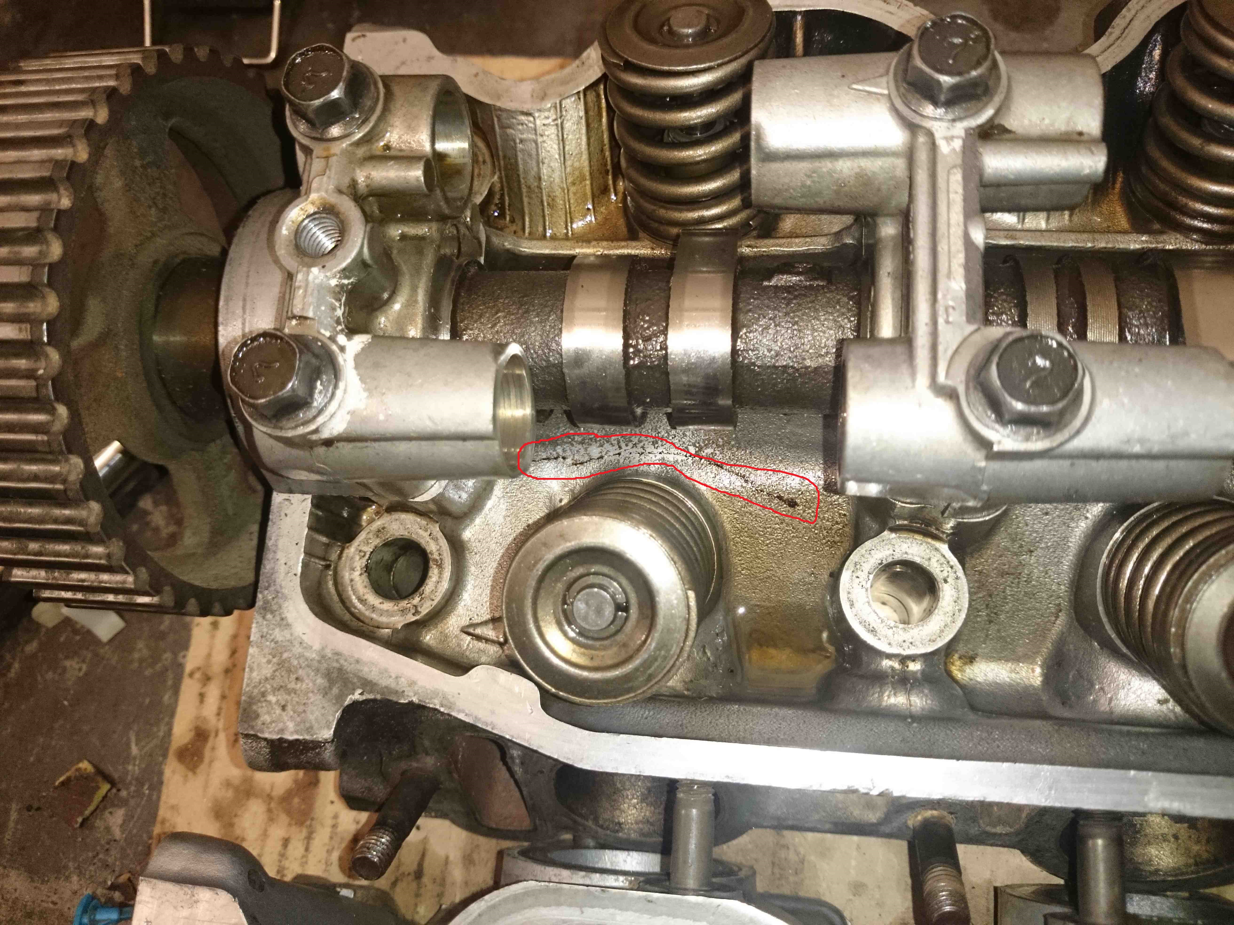 Наконец добрался до гаража.Гильз в блоке не обнаружил,проверял правда на ощупь но тщательно. Помыл головы,смущает две вещи,на правой что то очень похожее на трещину а на левой выборка на распредвалу и на постели ближней к шкиву.Что подскажите по этому поводу?