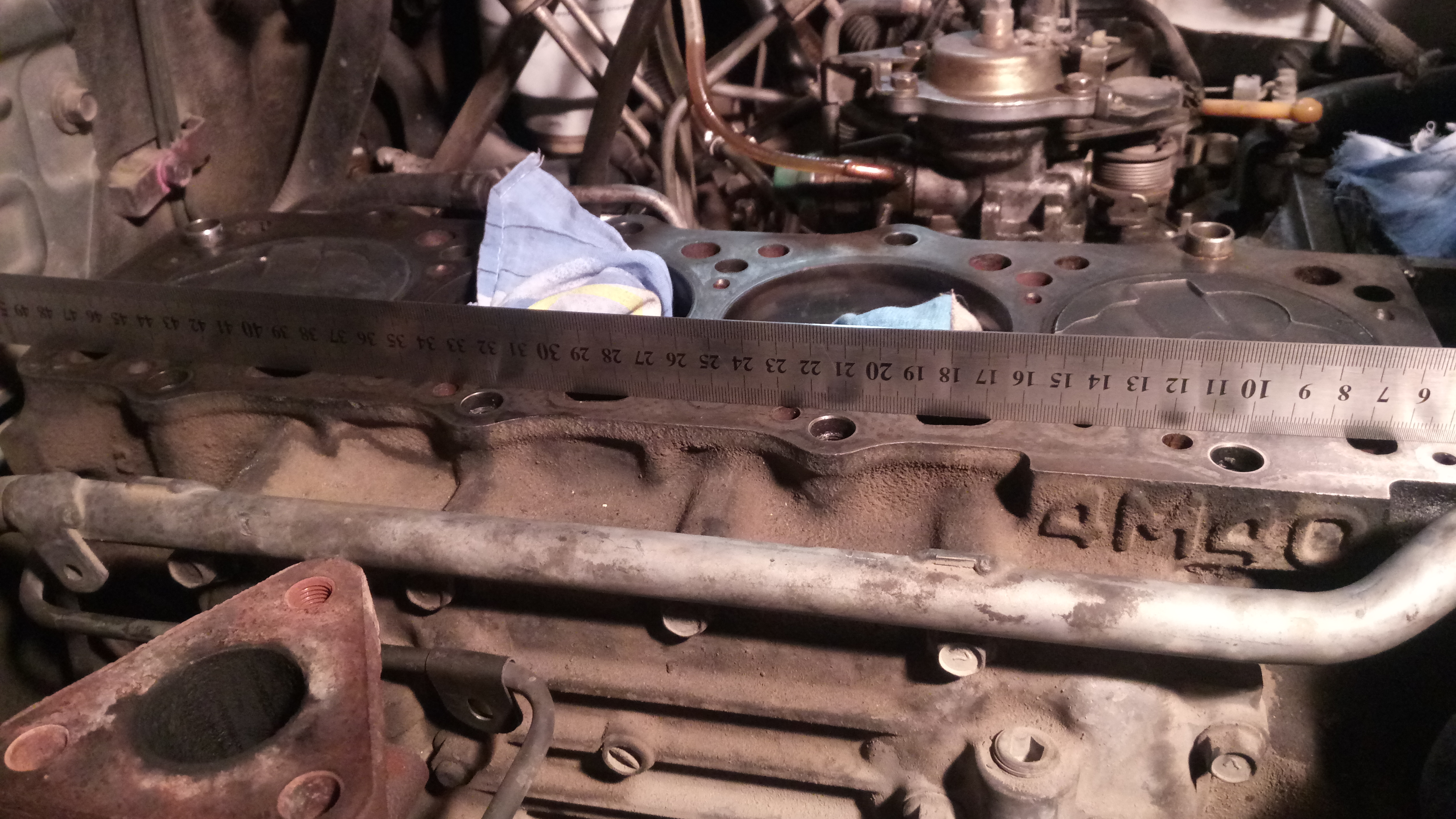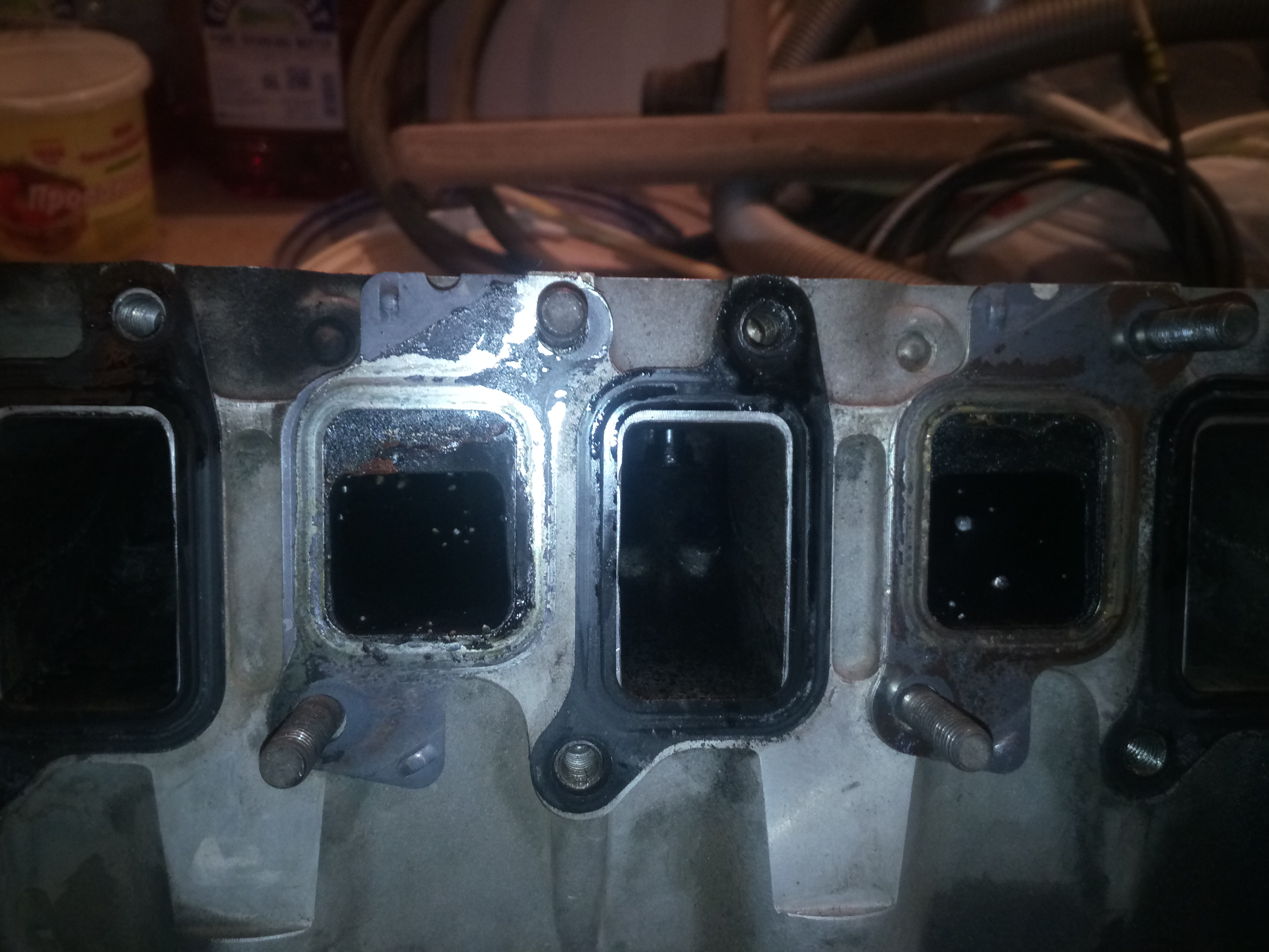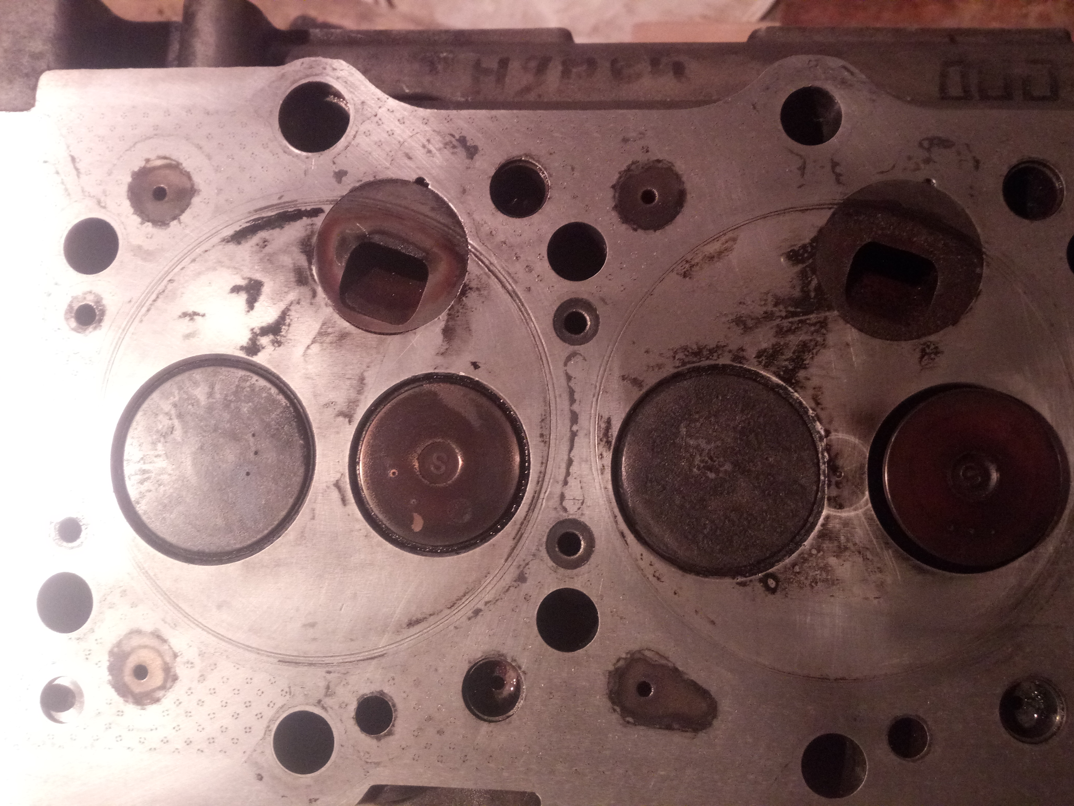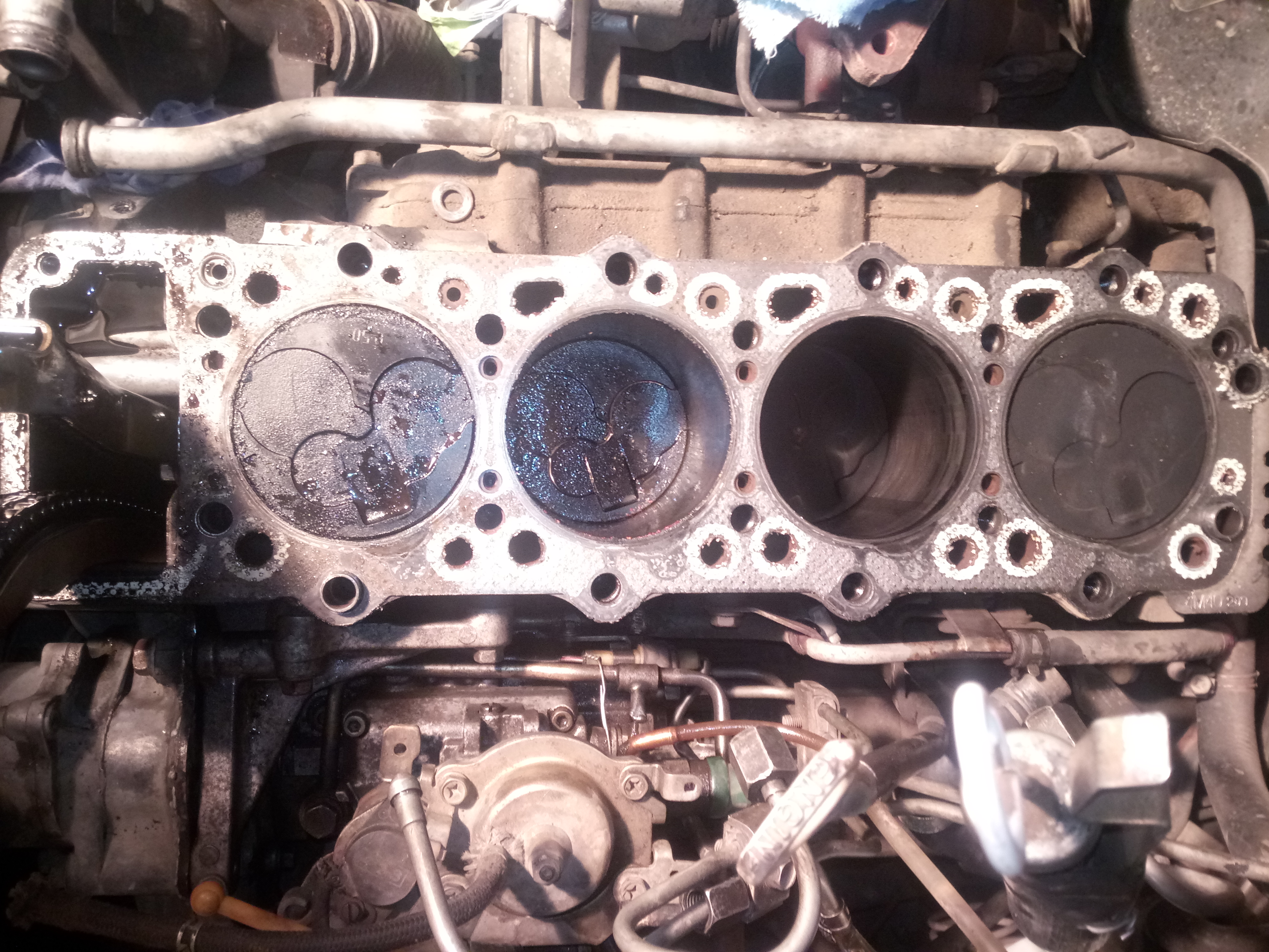 Похоже на солярке работали только 3 и 4 цилиндры ,а 1 и 2 на антифризе. Трещин визуально не видать. Прокладка вроде тоже целая