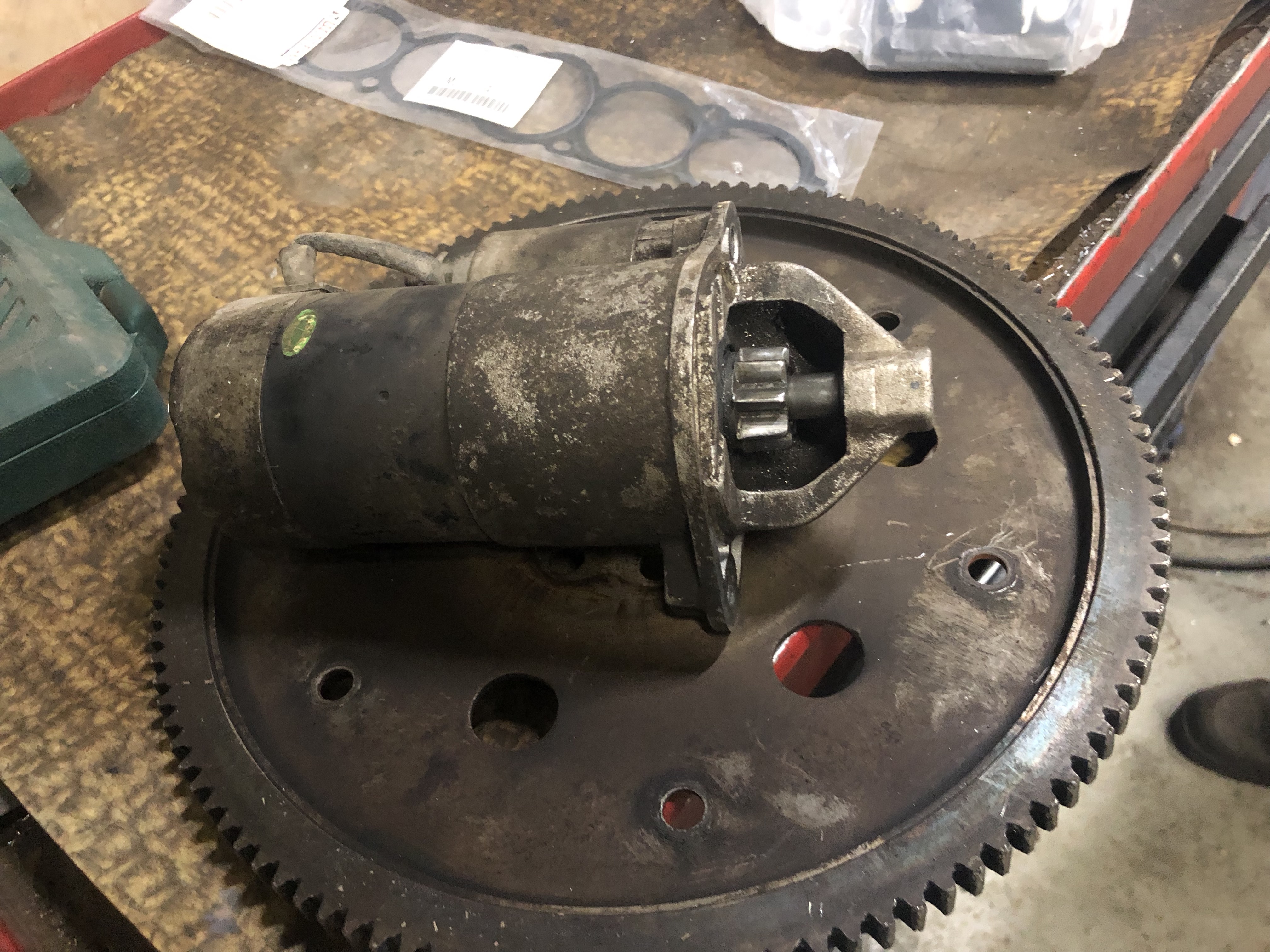 либо перетянутый, раздавливает места где отверстия под болты стартёра, и он прижимаеться ближе к мотору отводя бендикс от венца, на первой машине так и выяснил, чуть отпустил стартёр и забил колобашку между мотором и стартёром, и всё стало ОК