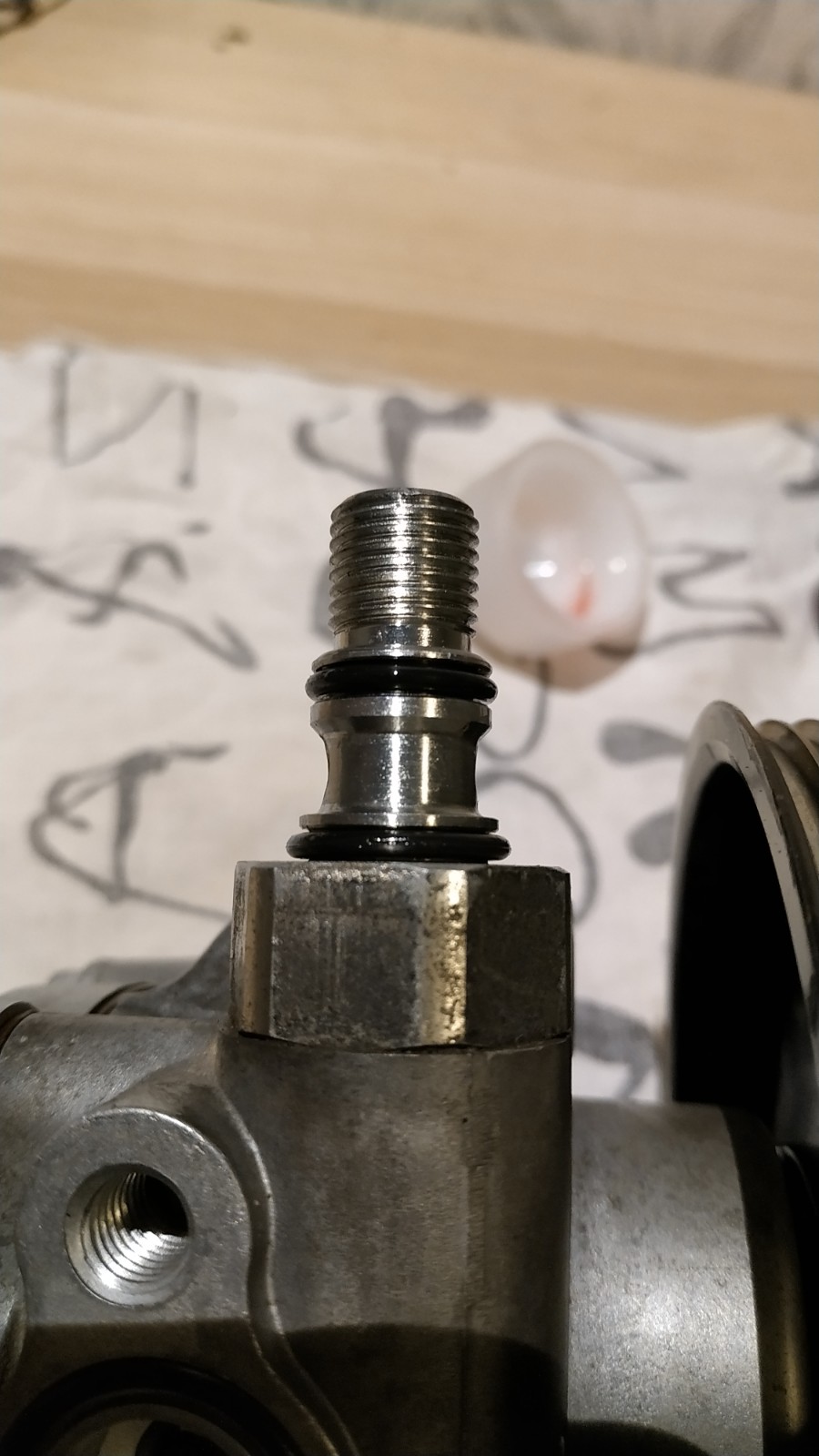 На уплотнение забора из бачка взял самую большую. На магистраль высокого давления сверху резиночка чуть поменьше, чем снизу. Точнее никак, эти резинки пронумерованы только в инструкции, сами по себе они маркировки не имеют. Затягиваем все резьбовые соединения. Остались уплотнительные кольца перепускного клапана и стопорное кольцо подшипника