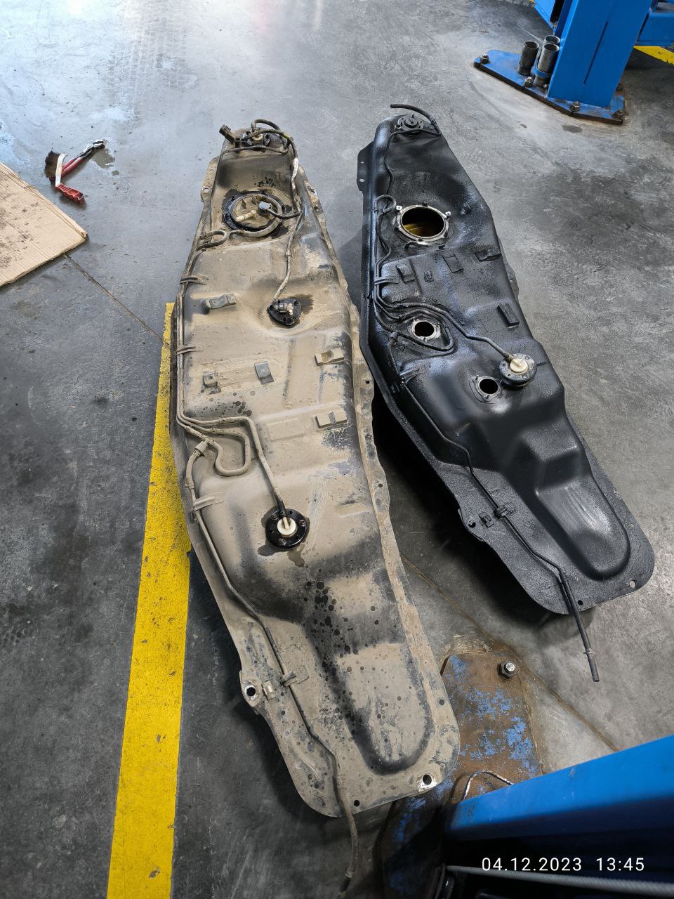 Оставлю это здесь. Точно кому нибудь пригодится. Менял себе бак после 12 лет эксплуатации. Паджеро араб V95W, 6G74 3,5 литра. Курил форумы две недели перед заменой, ездил по разборкам смотрел баки. Новый китай брать не хотел, не верю им, был опыт с новыми радиаторами, да и цена 10000 пугала. А оригинал бу начинался от 25000. Поэтому искал оригинал бу. Везде говорят что баки у всех одинаковые, различается обвес бензин/дизель, типа бери любой, не критично, лишнее не понадобится. Взял. Облизал его со всех сторон, подготовил для себя. Приехал. Результат на фото. Мой V95W длина 168 см, на 20 см длиннее чем один из всех этих «бери любой, все одинаковые». Такие дела. Век живи век учись.
