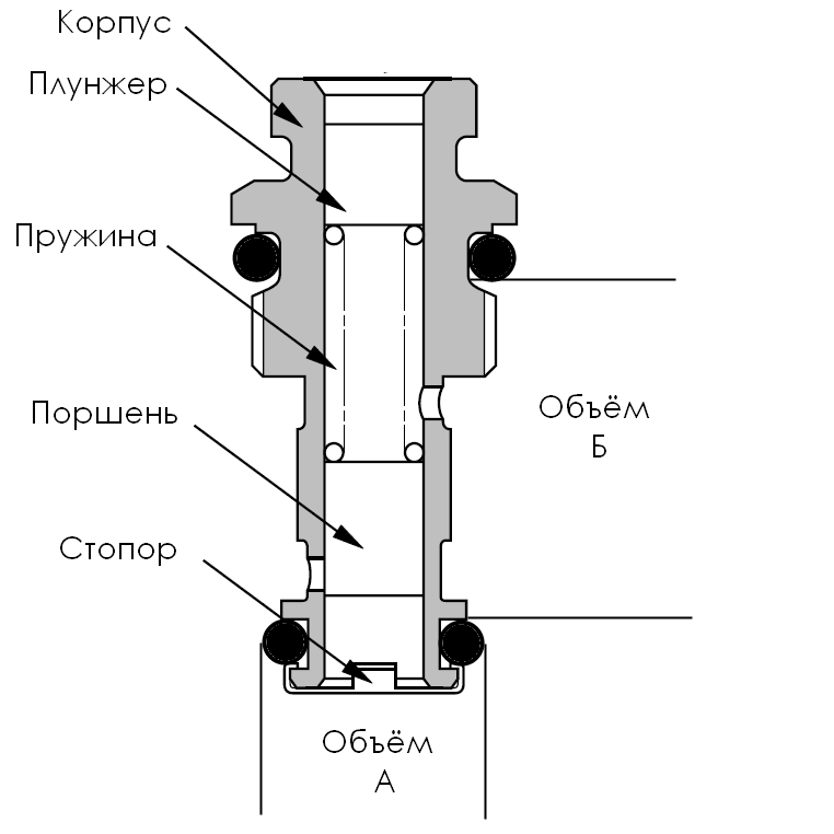 Когда давление в объёме "А" превышает силу пружины, давящей на поршень и силу давления из объёма "Б", поршень поднимается и начинает открывать перепускные окна, нагнетая его в объём "Б".