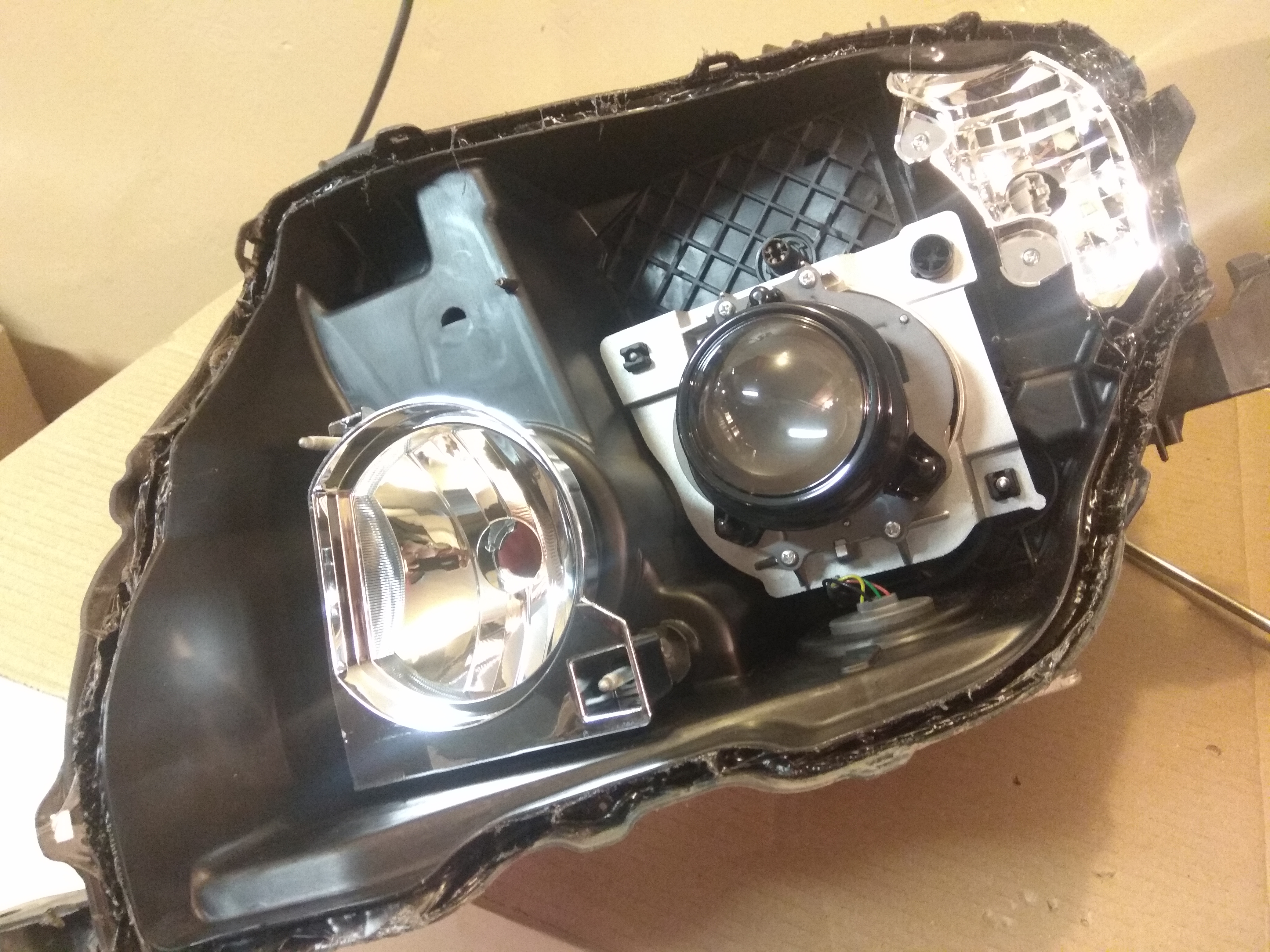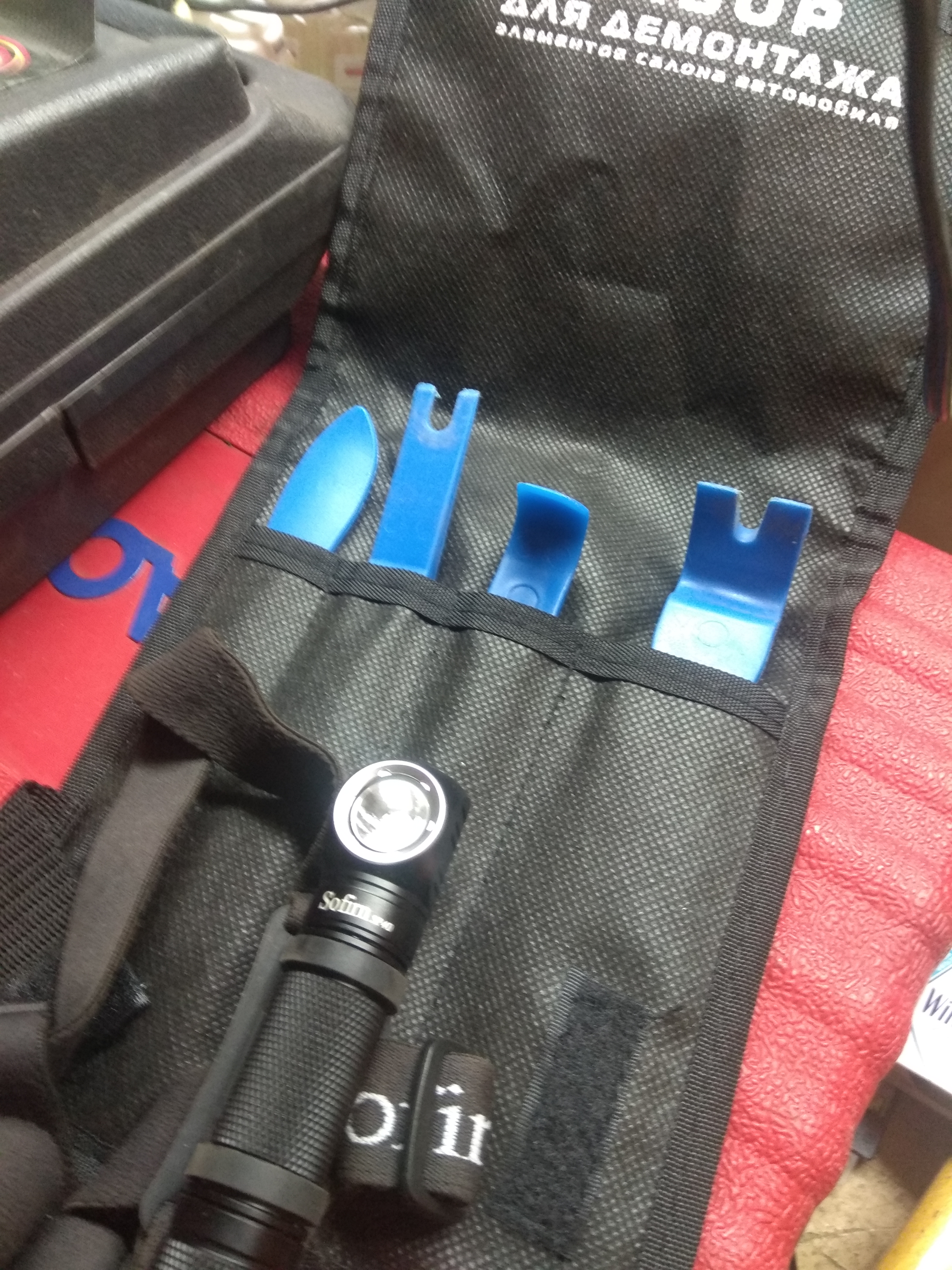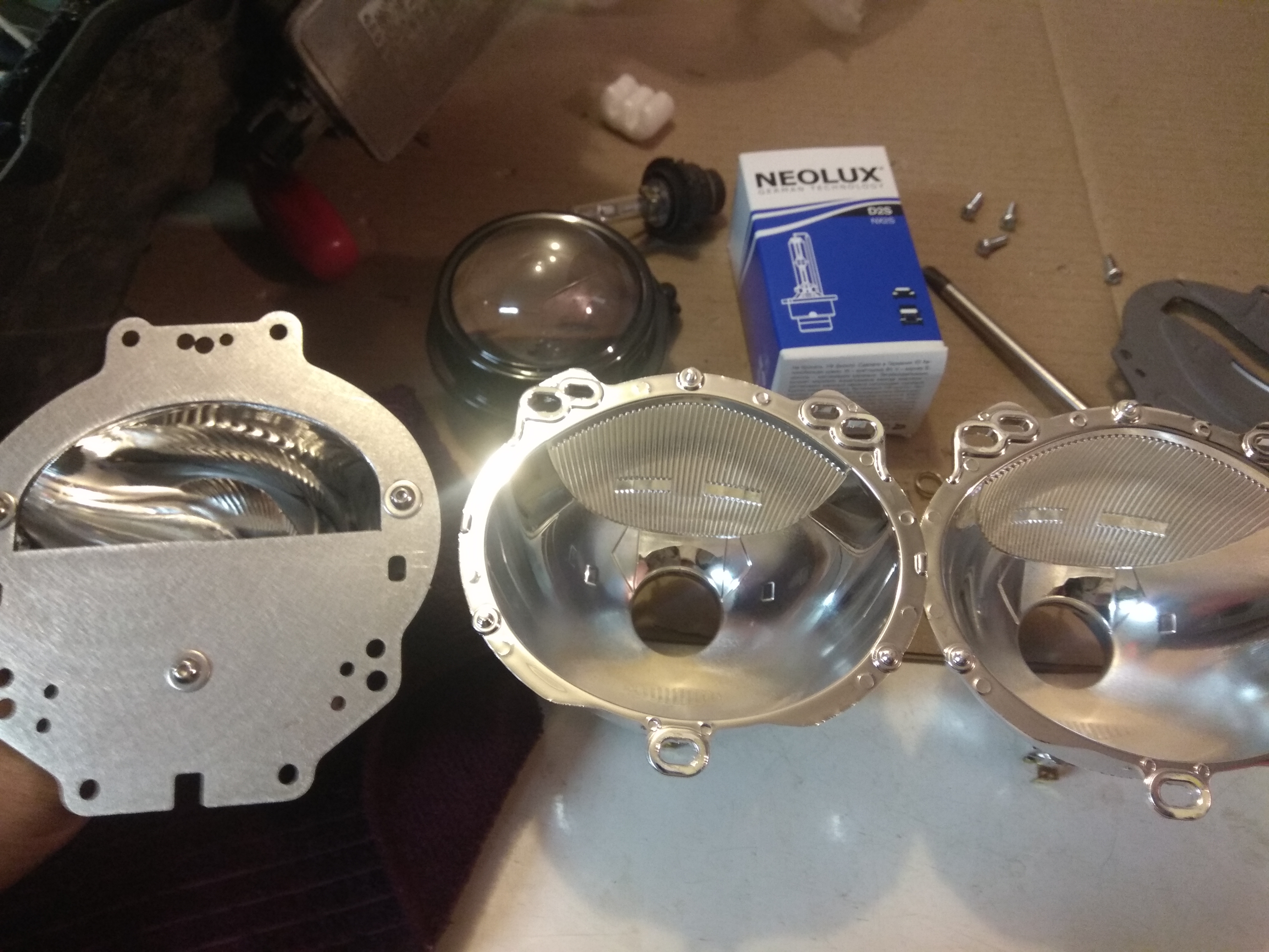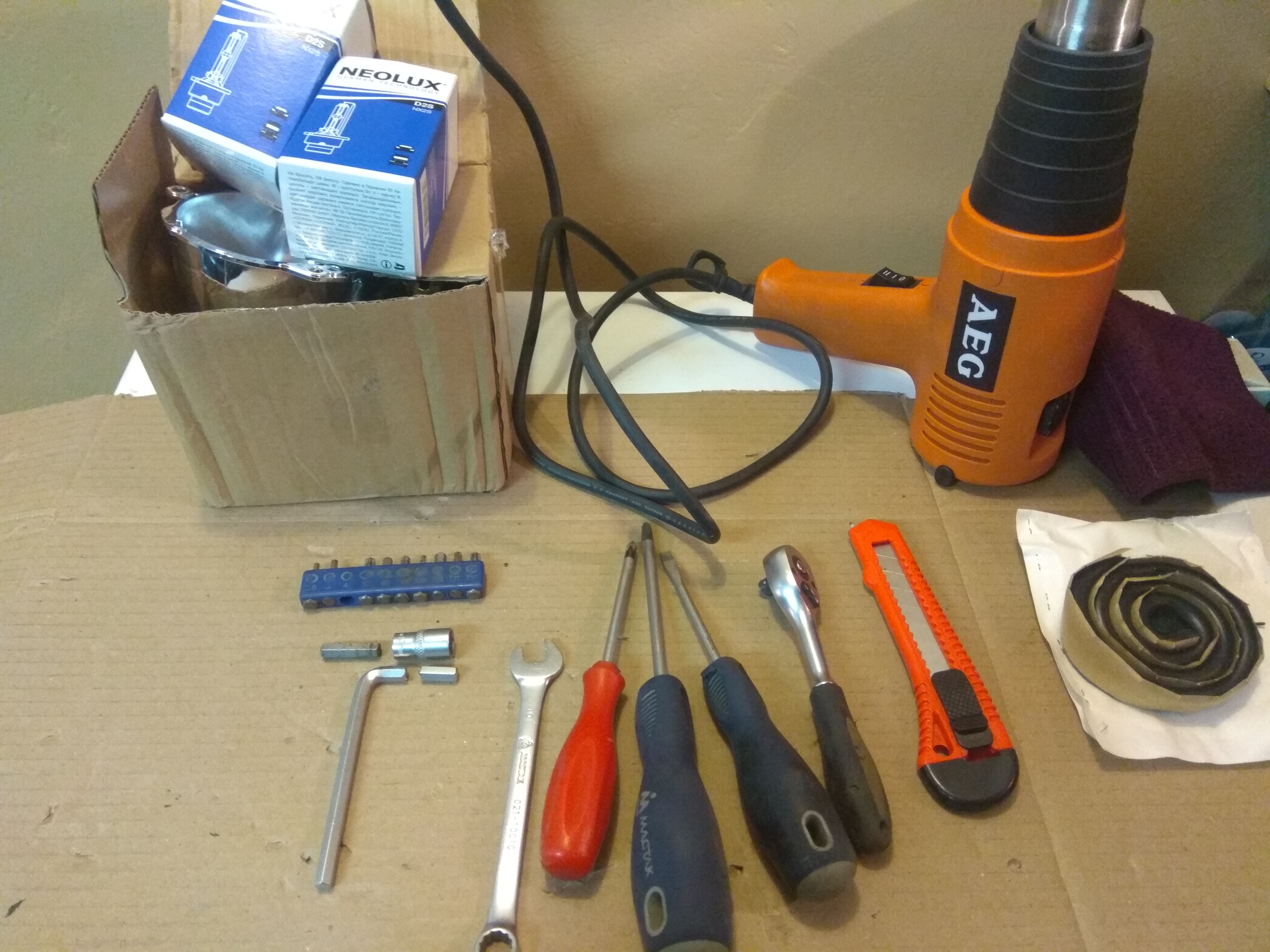 Заменил отражатели и поставил новые лампы.Герметика добавил по кругу ,но немного,и опять в коробку греть и склеивать.Установка в обратной последовательности.Заодно почистил передний автокорректор.Предварительно делал метки на противоположном гараже,после установки новых отражателей ничего не регулировал,осталось также.Инструмент которым воспользовался - на "картинке" (естественно пришлось жертвовать шестигранником под "хитрый" болт).