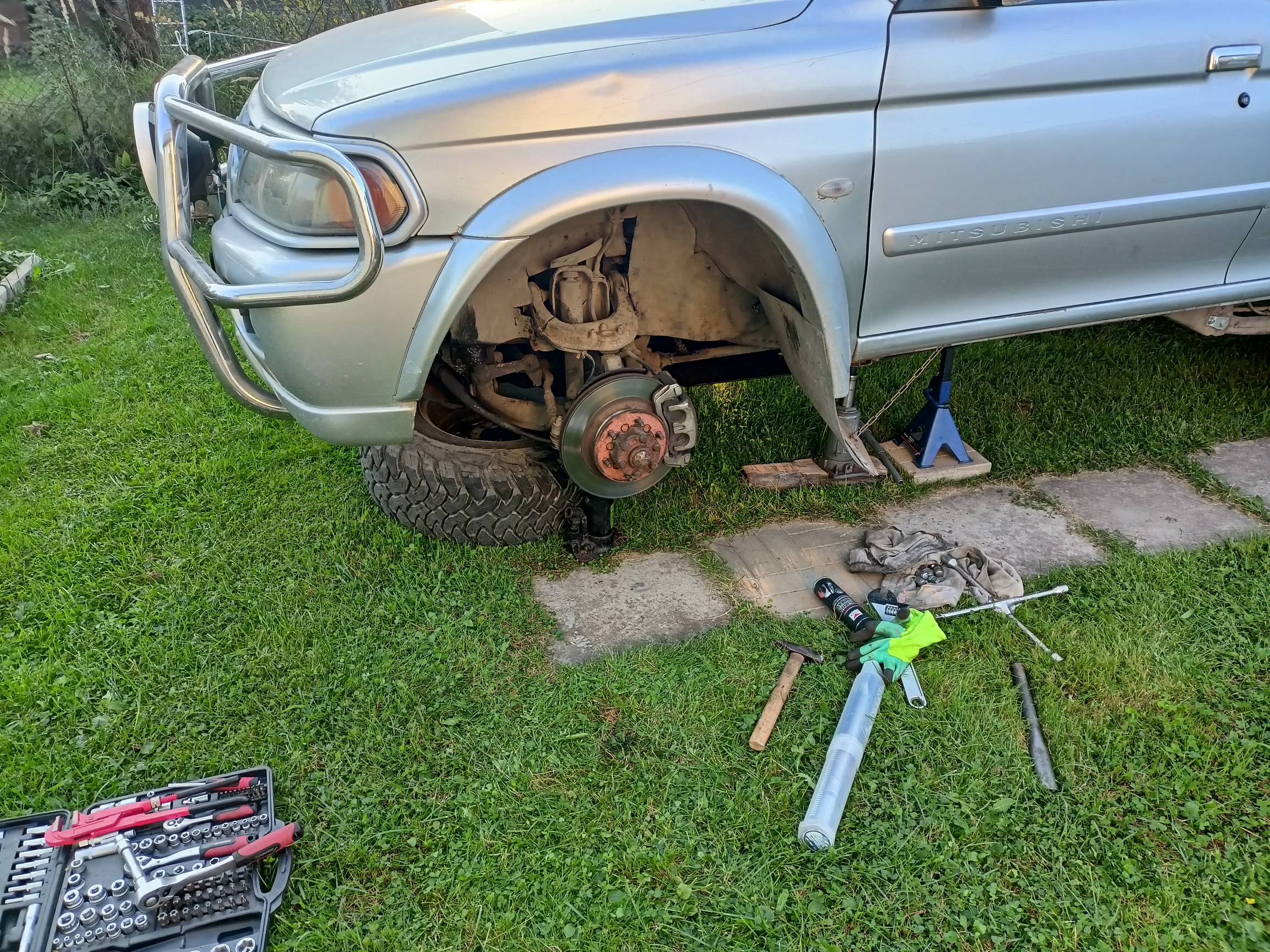 Ну а дальше все не сложно. Скинул для удобства колесо, вооружился силиконом( не подмажешь - не поедешь), газовым ключом(очень удобен в решении многих вопросов) и молотком. Ну просто потому, что без молотка в этой машине вообще никуда.