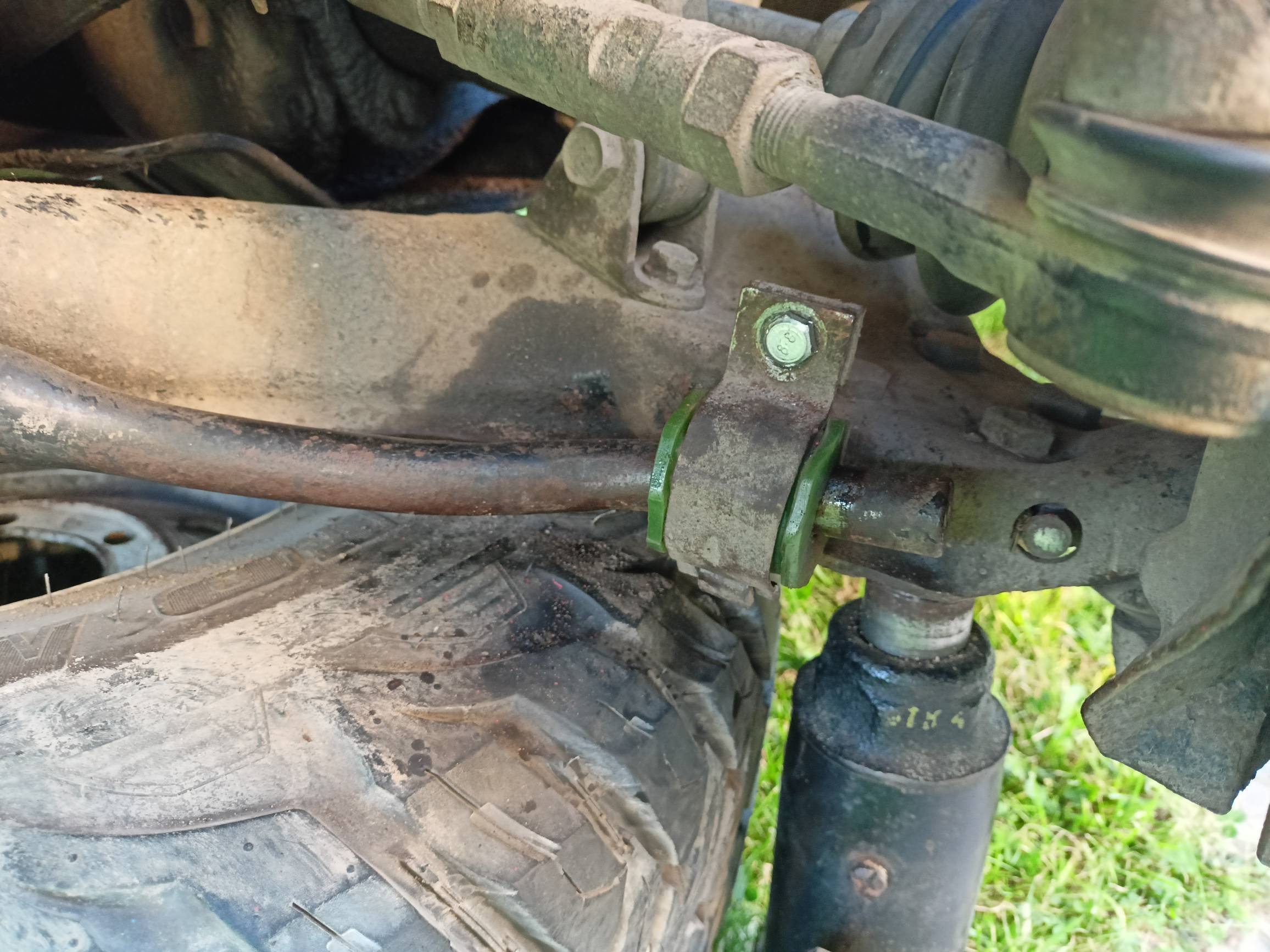 Ну ладно, я уже давно смирился с тем, что у него периодически что-то уходит в лучший мир. Походили, собрали немного грибов и поехали домой. Там ныряю под него, ищу. Сначала смотрю - вроде все на месте. Но стук то был! И тут понимаю, что не так - левая втулка переднего стаба на месте, да не на своем. Она вылезла из-под скобы. Ну дела. Не занаю, как это произошло, да и неважно это. Главное она целая, ее нужно просто запихнуть на место.