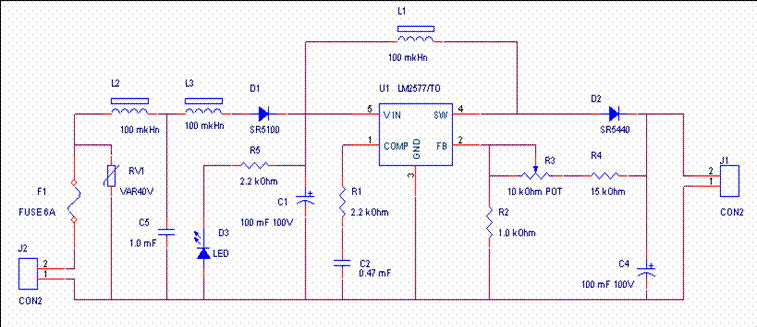 - Представленая схема преобразователя напряжения позволяет преобразовать входное напряжение 12-16 Вольт в стабильное напряжение 24 Вольт, ток в нагрузке до 3-х ампер. В качестве источника энергии предполагается использование Li-Ion батарей емкостью 6-12 ампер часов (4 штуки соединенные последовательно), Lead-Acid 12 Djkn или автомобильный аккумулятор. Необходимо учитывать, что при применении устройства надо позаботиться о схеме защиты батарей от глубокого разряда и схеме индикации состояния батарей. Индуктивность катушки 100-160 mkGn (52 kHz 5A). Регулировка выходного напряжения осуществляется потенциометром R3. На катушках L2&L3 собран фильтр для уменьшения уровня помех от генератора автомобиля. Если не требуется ограничение уровня помех - можно фильтр не устанавливать. Микросхему надо установить на радиатор.