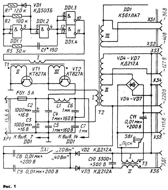 Внешний вид преобразователя со стороны лицевой панели показан на рис 2. Большую часть деталей размещают на плате из изоляционного материала размерами примерно 175x80 мм (рис 3). Соединения между деталями делают снизу платы. Другие детали монтируют на дополнительной плате, которую размещают на боковой стенке корпуса. Цепи преобразователя, по которым течет большой ток, следует выполнять проводом диаметром не менее 2 мм возможно минимальной длины. Это требование относится и к проводам, соединяющим преобразователь с аккумуляторной батареей. Микросхема DD1 преобразователя может быть К561ЛЕ5, диод VD1 — любой высокочастотный малогабаритный, транзисторы VТ1 и VТ2 — КТ827 с буквенщыйи индексами Б, В Выпрямительные диоды VD2—VD7 должны быть высокочастотными, например (кроме КД212А), КД205А — КД205Д, КД213А, КД213Б. Конденсаторы. С1 — КД, КТ, КМ; С6 и С7 — КМ, МБМ; С2 и СЗ — К50-24 (или К50-6), остальные — БМ, МБМ. Индуктивность дросселя L1 может быть 10 . 200 мкГн. Трансформаторы Т1 и ТЗ выполнены на кольцах типоразмера К20x12x6 из феррита 2000НМ. Обмотка I первого из них содержит 120 витков, а обмотки II и III — по 45 витков провода ПЭВ-2 0,2. Первичная обмотка трансформатора ТЗ представляет собой 2 витка, а вторичная — 20 витков провода ПЭВ-2 0,4 Магнитопроводом трансформатора Т2 служат два склеенных вместе кольца типоразмера К32x20x9 из феррита 2000НМ. Его обмотка I содержит 1,5 витка провода ПЭВ-2 2,0, обмотка II — 88 витков провода ПЭВ-2 0,4 (отводы от 36 до 50-го витков, считая от начала), обмотка III —16 витков провода ПЭВ-2 1,0 (отвод от 14-го витка) Перед намоткой провода острые грани колец надо сгладить надфилем, после чего обмотать магнитопровод лакотканью или изоляционной лентой.