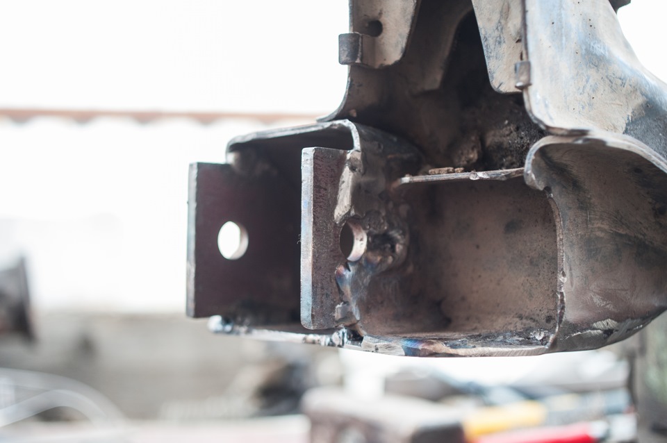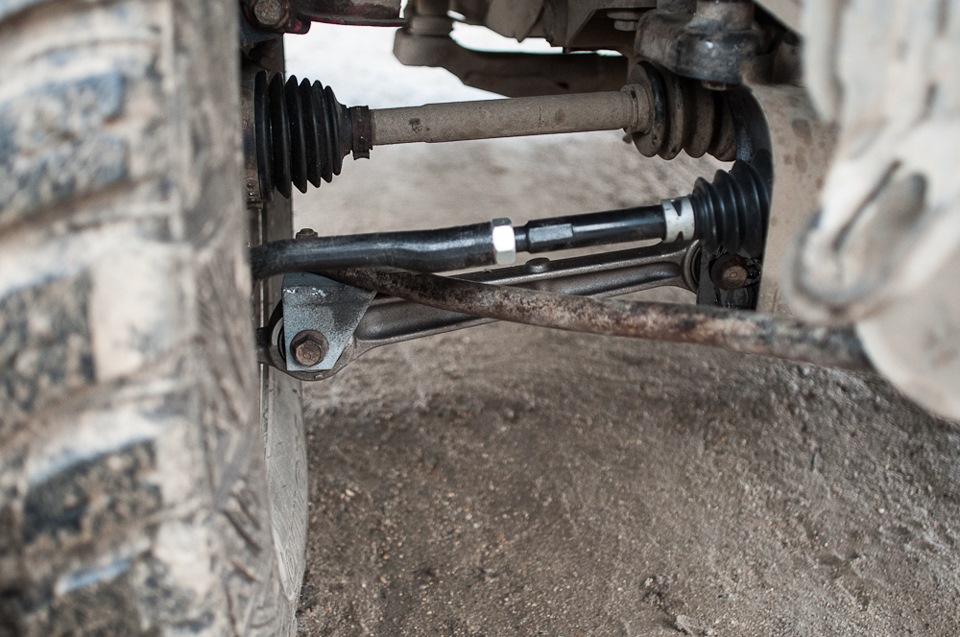 Рейку может порвать, но тогда нужны колёса минимум 35" и машина гораздо тяжелей Джуниора. А вот тяга гнётся на раз, как и рычаг! Причём мне удалось побороть слабость штампованого рычага усилениями, но сайлент-то оставался прежним. В итоге быстро убивался сайлент и гнуло крепление нижнего рычага. Сейчас я решил сразу 3 проблемы с рычагом.