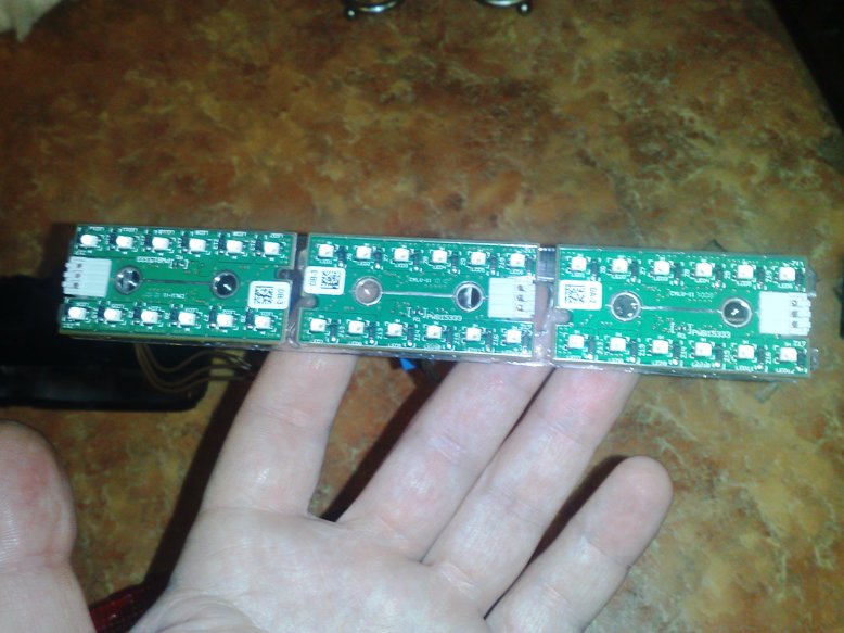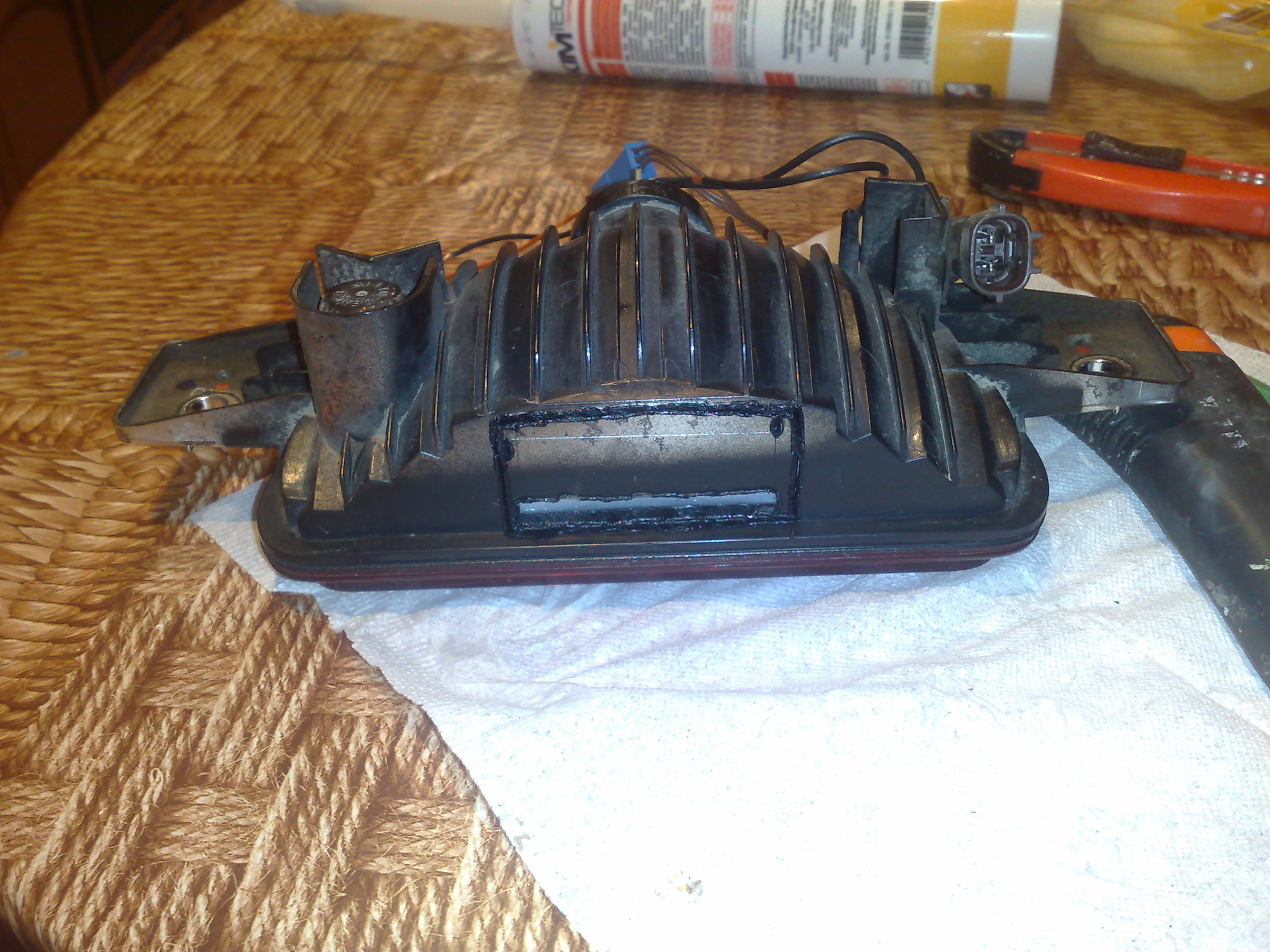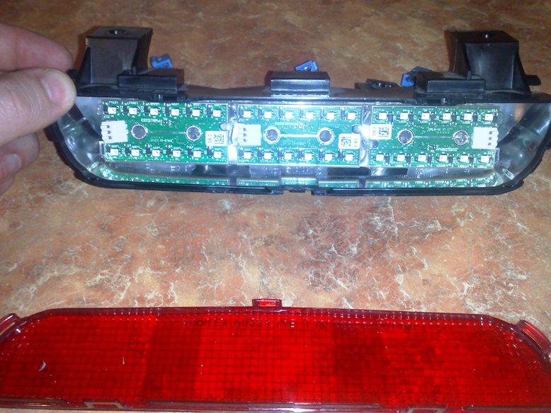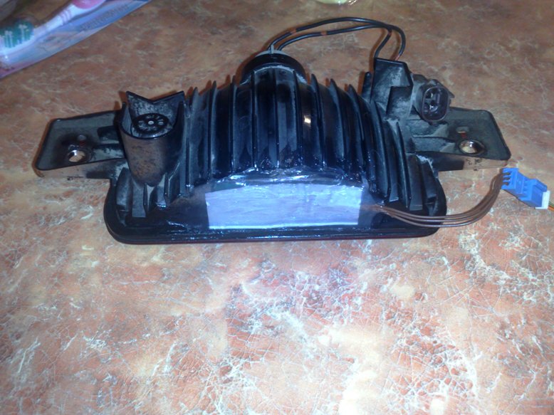 После установки светодиодов в катафоты и подклучнения их к гоборитам, мне показалось что дополнительный стоп сигнал непомешал бы. Думал вкорячить светодиодную ленту, но ненашёл достойного места. Тут подвернулась холявная светодиодная плата, и решил её воткнуть в фонарь противотуманки на запаске. Но сделать так что бы осталасть функция противотуманки. Вот что получилось.