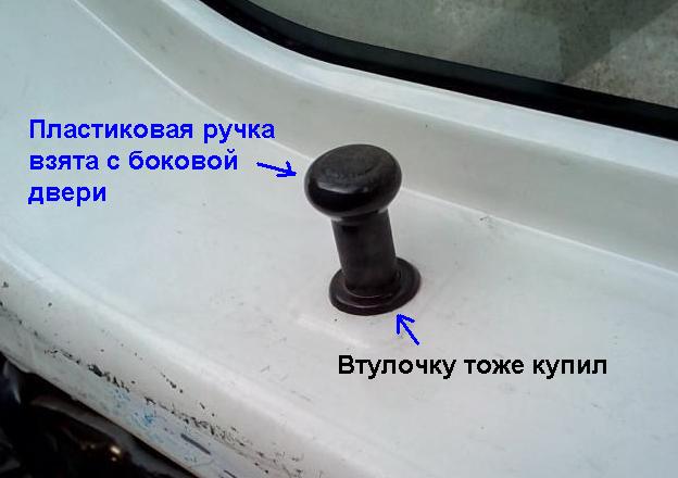 Так вот. Нашёл я комплектацию джуника в каталоге, где такая пимпа (ручка) имеется, и купил следующее - тягу, и вместо заглушки - муфту. Саму пластиковую ручку снял с боковой двери и прикрутил на тягу, а на боковые двери купил хромированные (или алюминиевые, блестящие) ручки от ВАЗа.
