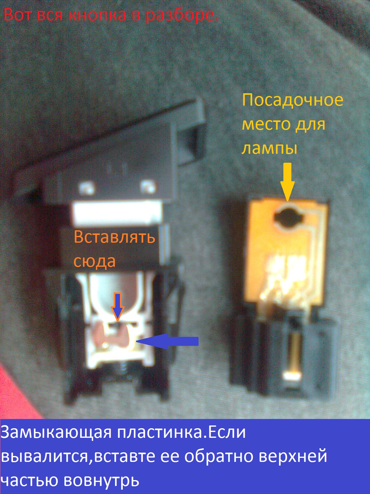 13.Собираем все в обратном порядке, будьте аккуратны, из подвижной части может вывалится замыкающая пластинка , если она вывалится, то вставте ее обратно большей частью вниз к пружине. Когда соберете кнопку (соедините 2 ее части), прежде чем ставить ее обратно, проверьте ее работу на нажатие, прямо в руках!