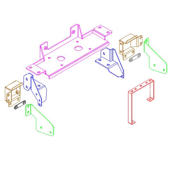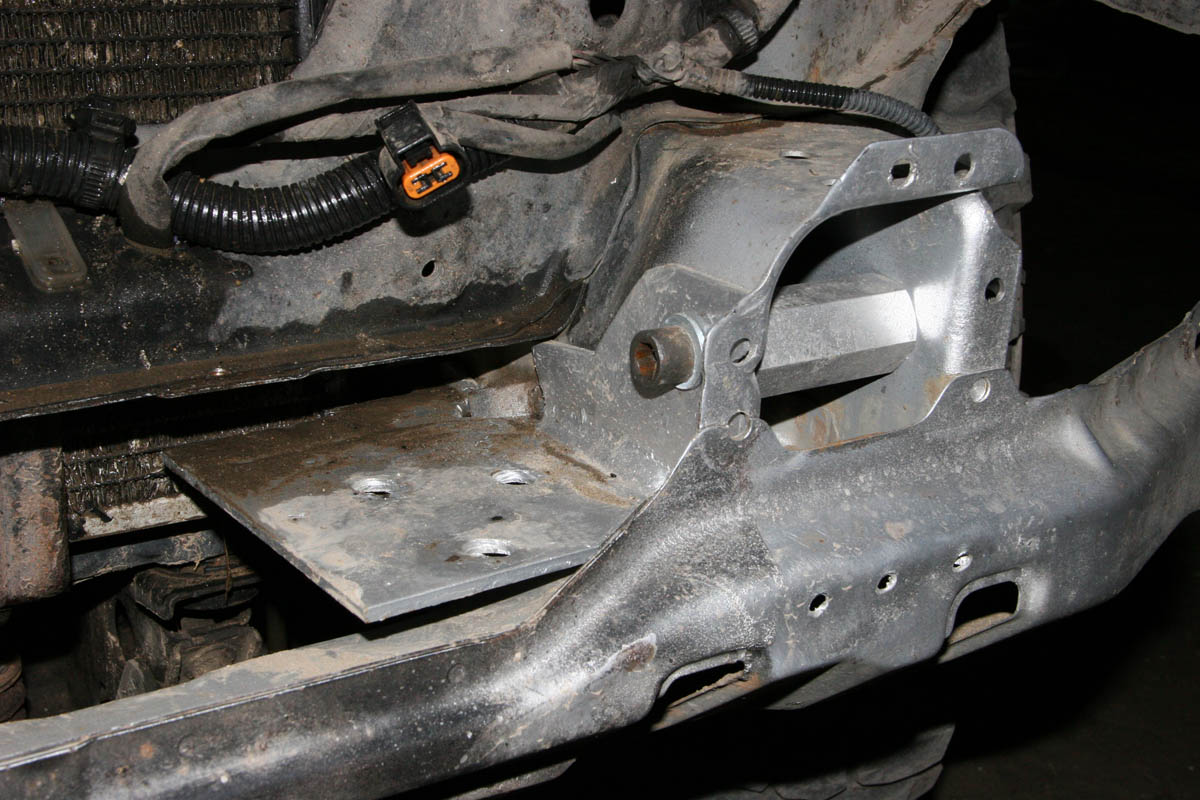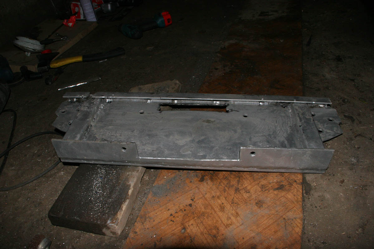Деталей три штуки, сама площадка и ухи-крепления всё из 5мм железа + усилители из профиля и уголка. Делал выкройки, пилил, варил, примерял опять пили и варил. Сквозной проход желателен, т.к. внутренняя стенка рамы тонкая, а цепляться только за проушину бобоялся, да и основная нагрузка будет на передние болты, а проушина утоплена назад.