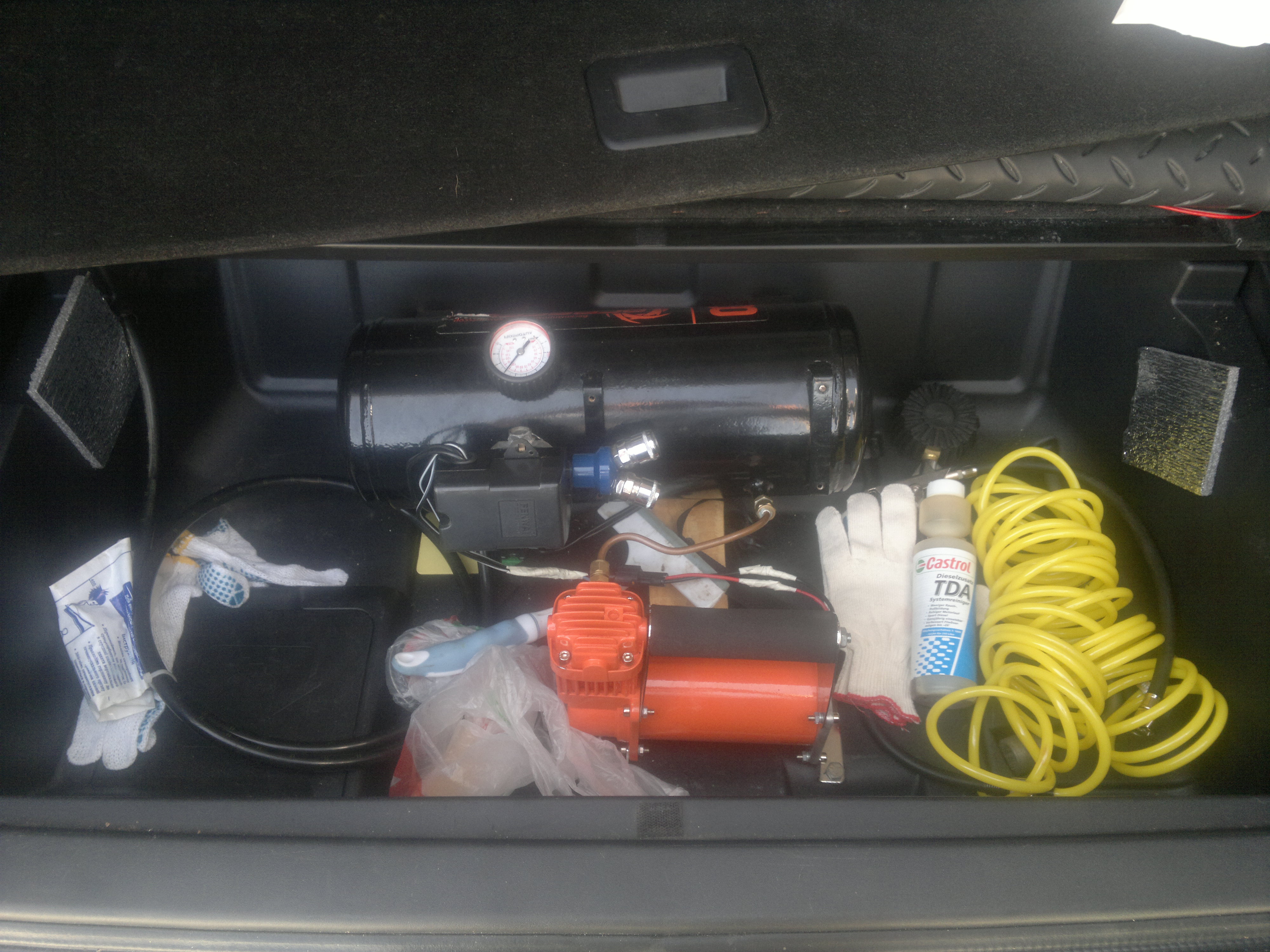 А под капотом местечка не нашлось? Объемный компрессор? Тянуть-то воздуховод из конца в конец машины не близко.kan696 писал(а):а я отдельно поставил воздушные гудки! компрессор и ресивер в нишу 3го ряда сидений , 9 атмосфер на выходе 3 раструба, результат превзошел все ожидания!