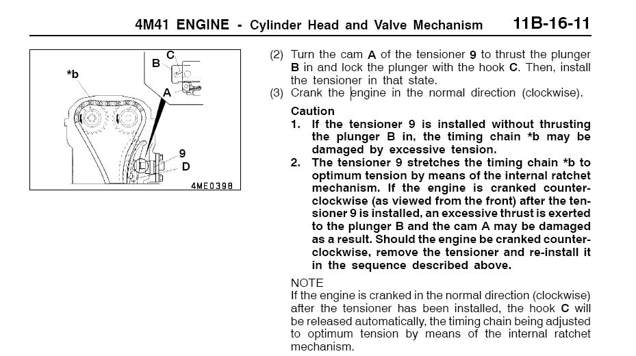 Русским языком - взводить нужно кулачок (А) чтобы плунжер (В) зафиксировал крюк (С) (храповик). И обязательно крутить двигатель (коленвал) ПО часовой стрелке (т.е. по нормальному рабочему направлению). В противном случае (если не "взвели" или направление поворота коленвала попутали) - возможно повреждение цепи!