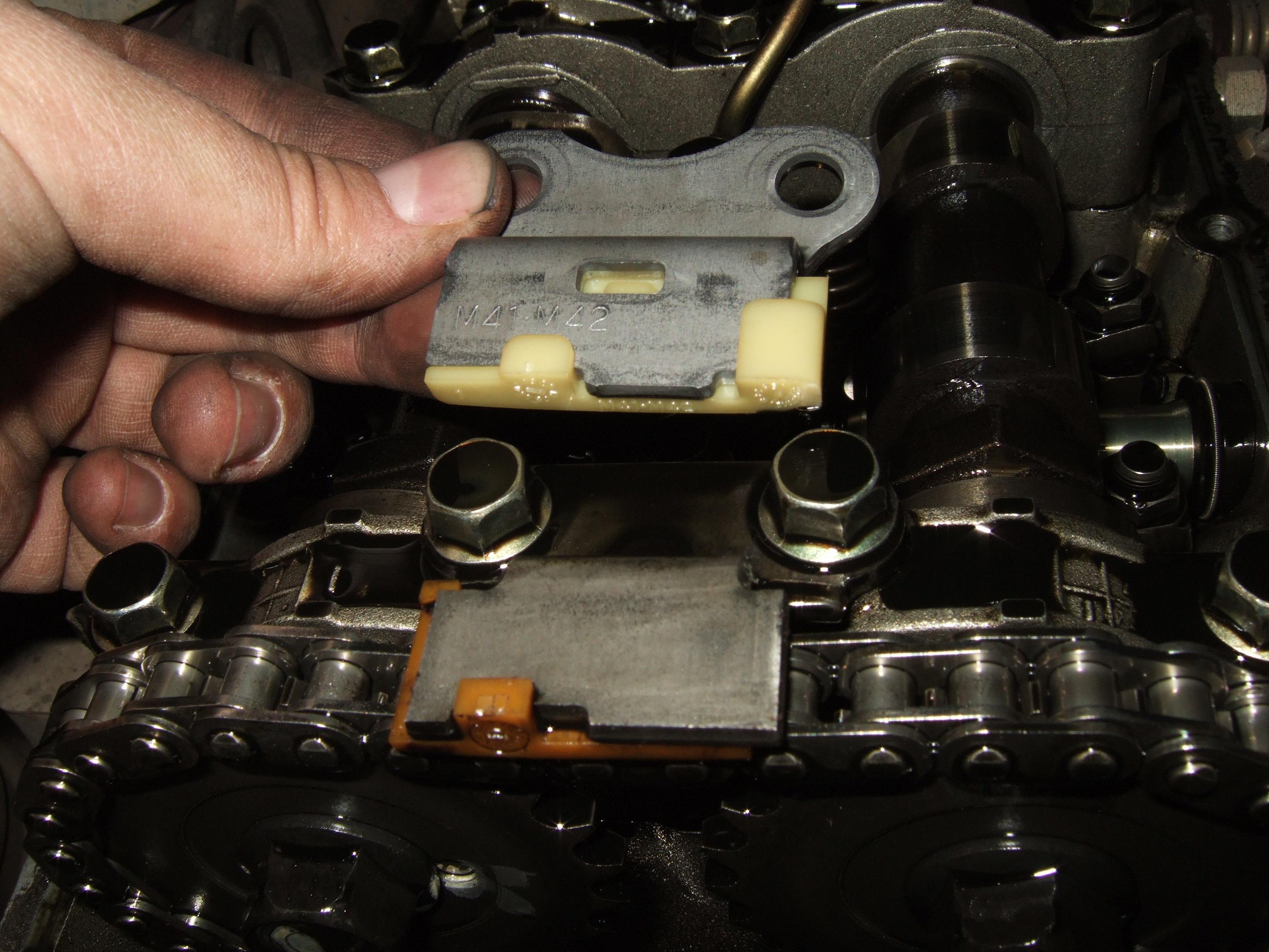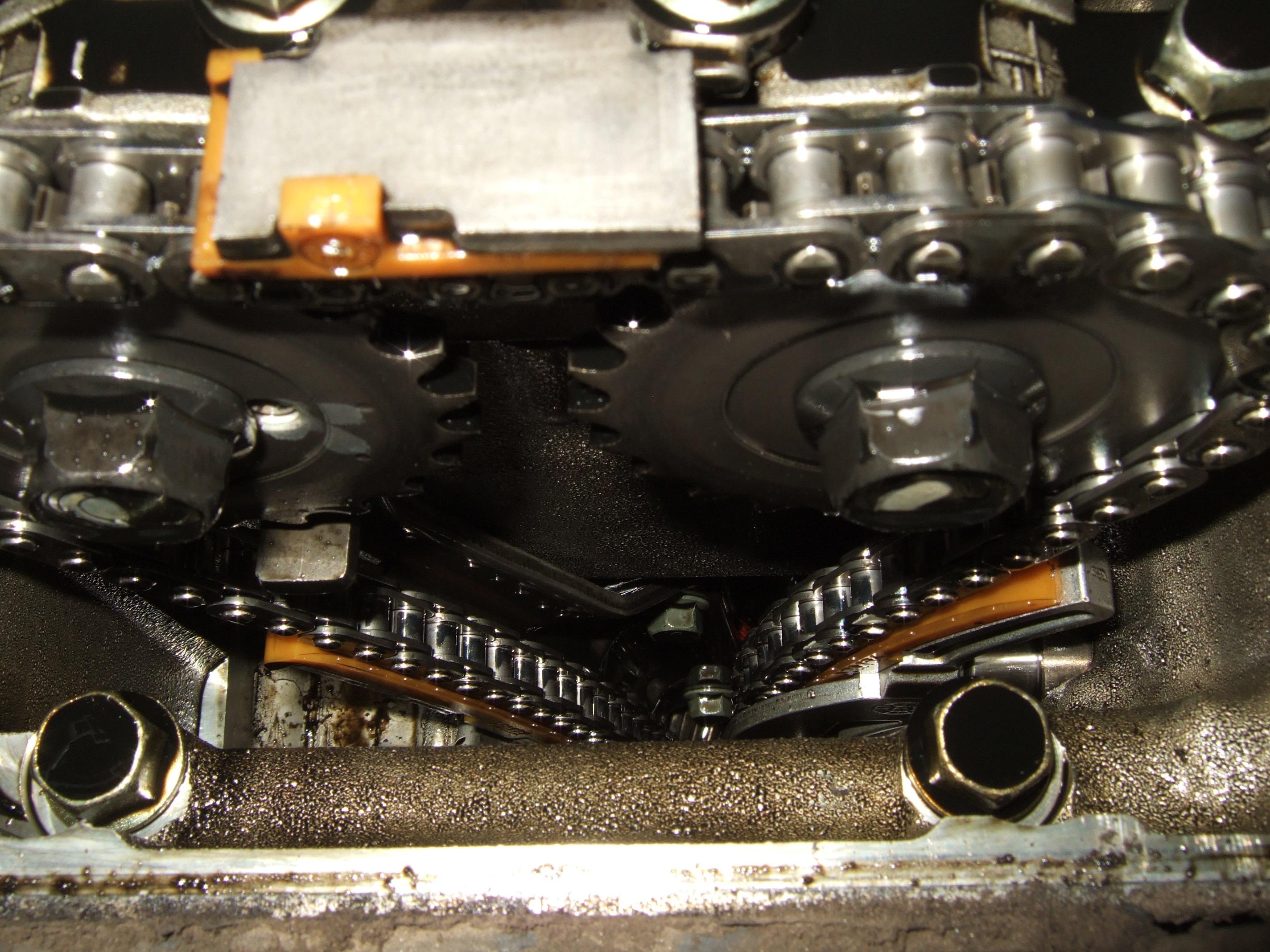 ); цепь не тянется - пришлось снять натяжитель, чтобы новый верхний успокоитель нормально прикрутить.