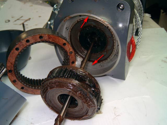 Видимо Форосенко разбирал лебёдку из первых партий DS-ок, так как обзор он делал в декабре 2006г. В помеченных мною красными стрелками местах на его фото отсутствуют отверстия. И действительно, без них повернуть редуктор на 90гр не получится, без возникновения пары "лишних" болтов. На моей же лебёдке Come Up Seal DS 9,5rs, купленной пару недель назад из последней партии, отверстия в этих местах имеются и всё без проблем прикручивается.