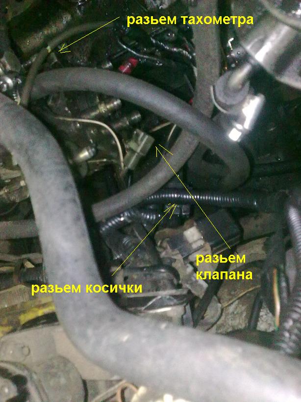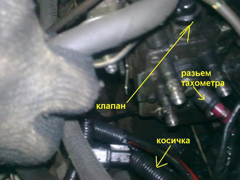 вот датчик оборотов для тахометра, разьем закреплен на тнвд, в него и вставляется разьем косички клапан отсечки сверху, от него один провод идет сама косичка тоже на разьеме, но я ее еще и в толстую оплетку запихал. ну а это кортинка из мануала, на всякий случай как то так