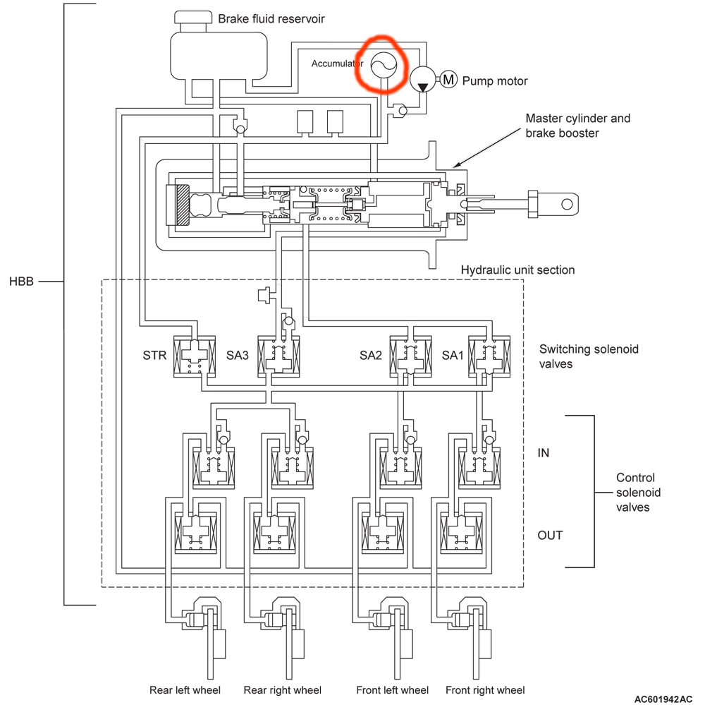 The accumulator is pressurised with nitrogen gas and accumulates the hydraulic pressure which is generated by the pump motor.