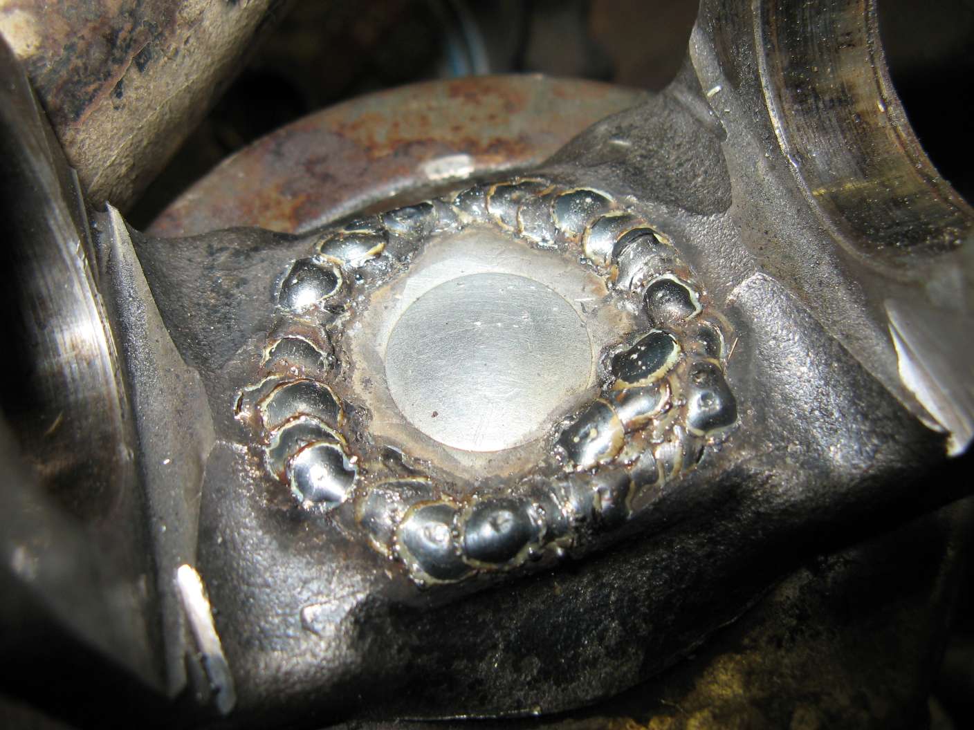...карочи, хадил я хадил вакруг снятого кардана, и решил, сниму-ка я на хрен крестовину... Снял. И вот что я увидел на етой рогатке. По кругу вокруг заглушки набиты риски и пришлось счищать тонкий слой черного обыкновенного герметика... И что удивилило, в шашках с игольчатыми подшипниками не было ни грамма родной литольной смазки, зато было в нем много трансмиссионки... Окак! Заварю все по кругу, как научил de, на его фото ясно фсе видно. Есть сварка инверторная, есть копромат, какой варить, братва???
