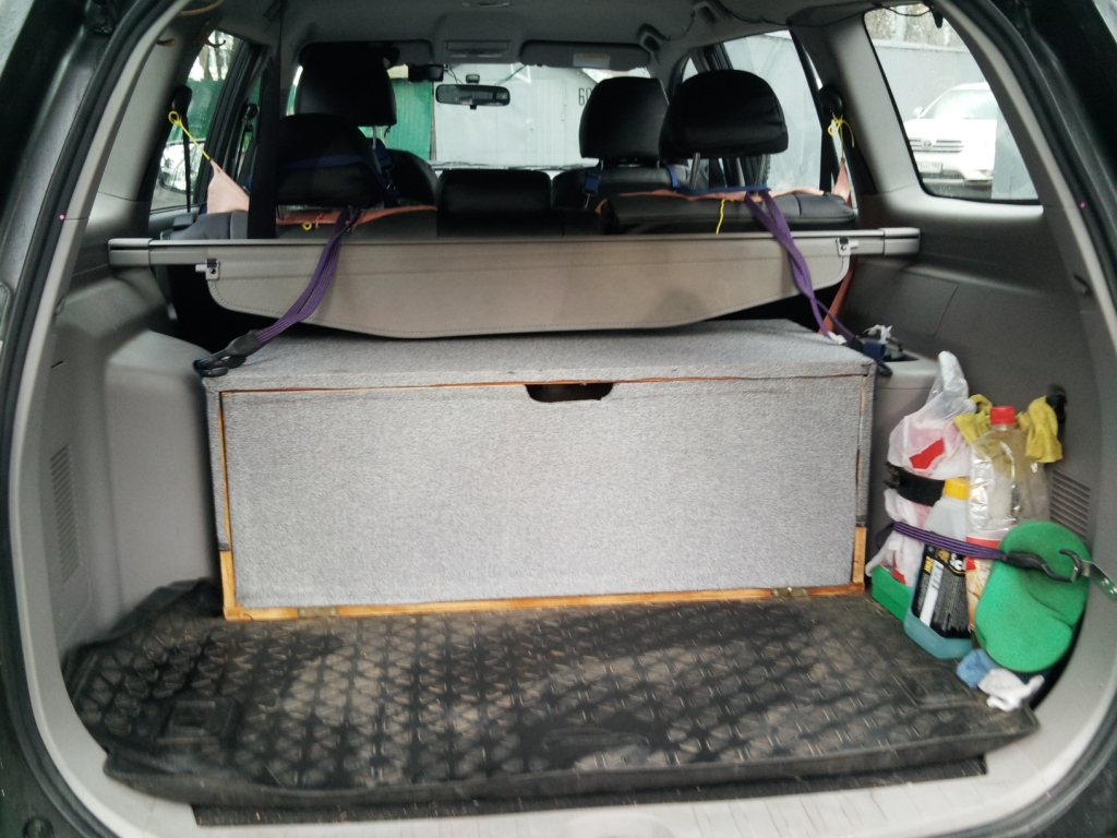 Есть ящики для инструмента по высоте схожие со сложенными сиденьями, есть чемоданы типа самонайта, но у костра на самсонайте мне будет не по себе...
