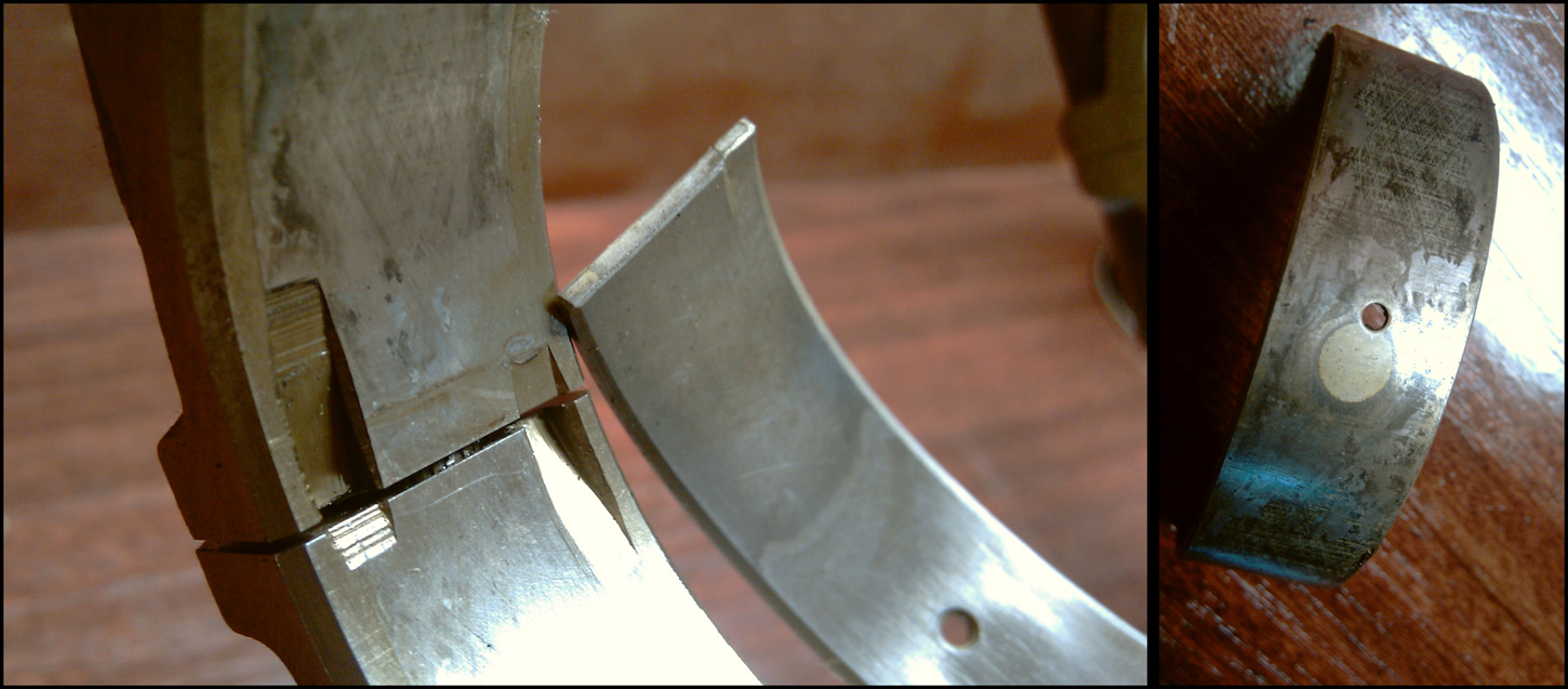 Вот так интересно стоял один шатунный вкладыш. Судя по обратной стороне, он был провёрнут сразу после сборки и ходил так до последнего...