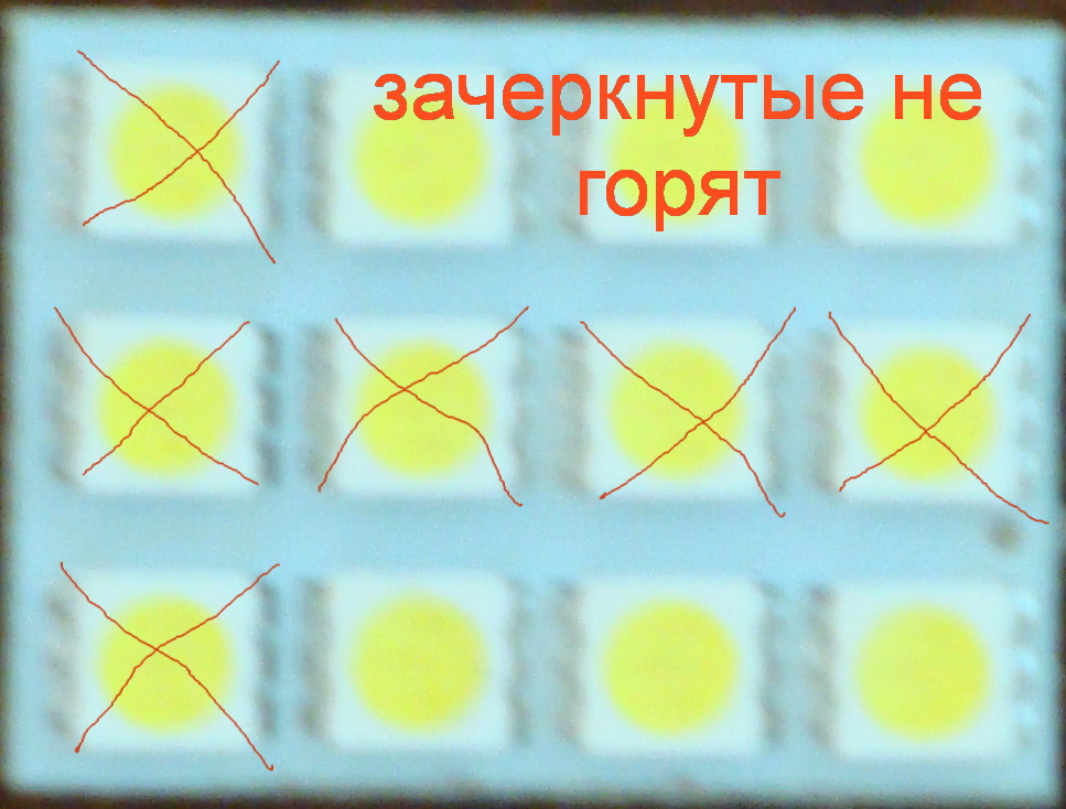 Стал думать, как быть. По совету Андрея (Lebed) перепаяли мне пластину, так, чтобы осталось гореть 6 диодов из 12 (на фото).