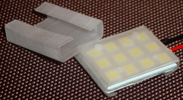 Опробовал-все равно слишком ярко, да и видно горящие светодиоды сквозь плафоны, как-то не очень мне это показалось. Решил я сделать дополнительное светорассеивание. Под руку попался ПЭТ 0,7мм, прозрачный. Заматил его тонкой наждачкой, согнул, одел на плату получившийся плафончик (на фото), включил-хорошо! Но были сомнения в его термостойкости, греются ведь светодиоды при работе, а иногда (особенно осенью-зимой) подолгу сижу в машине со включенным светом, да и на сервисе его никто никогда не выключает.