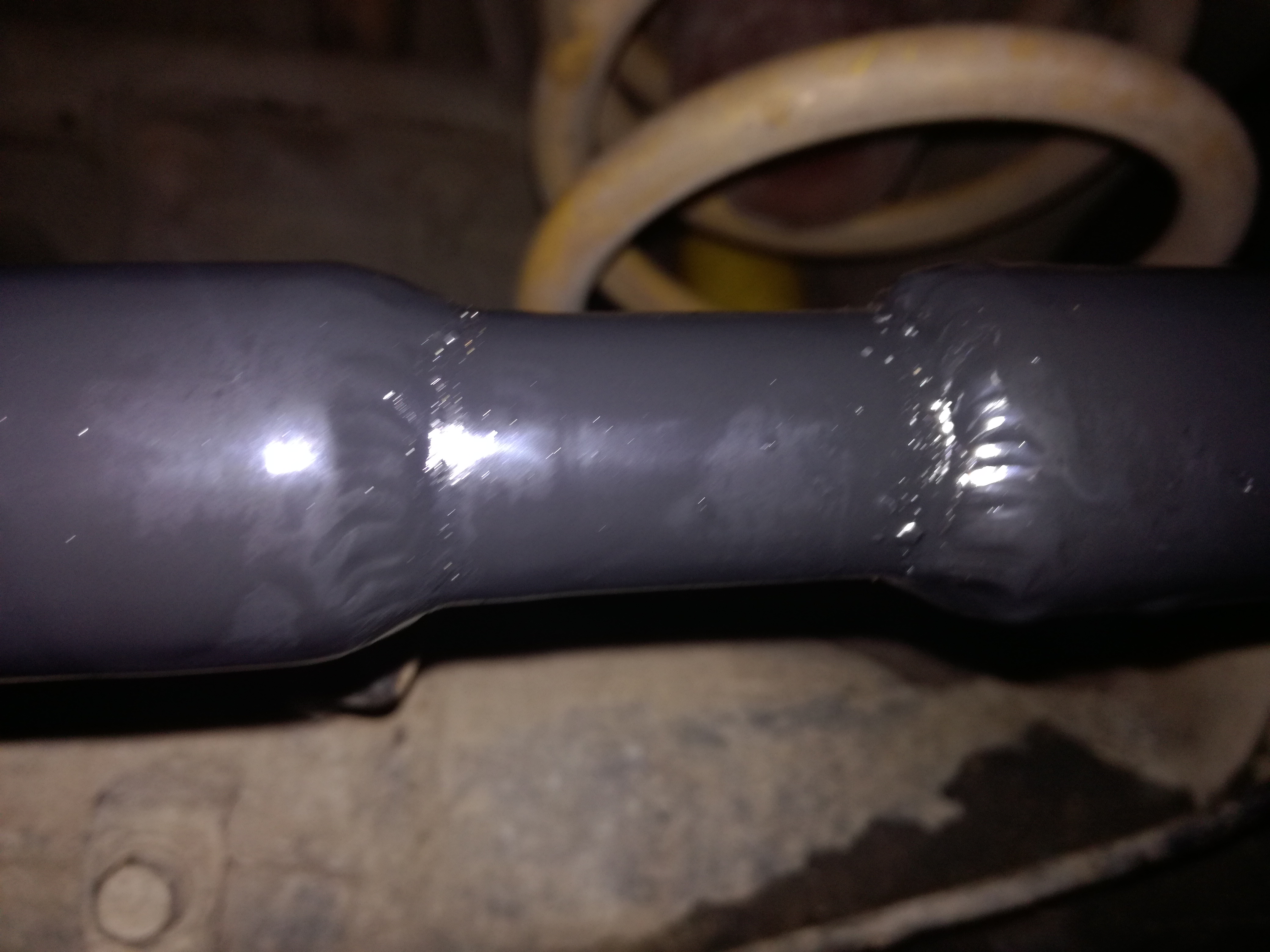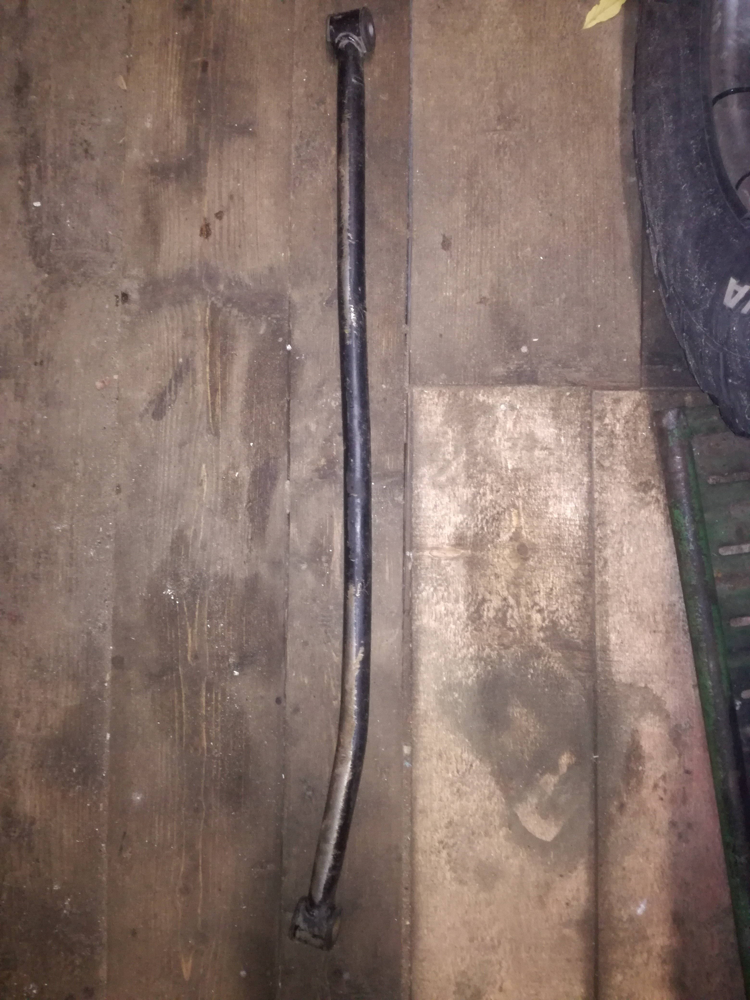 Тяга Панара гнутая в трех плоскостях и выпрямлять ее вообще не вариант. Винтом пошла. Взял тягу от двойки, естественно заменив с/блоки. Длинна 96 см, внутренний диаметр 24. Вставку делал из прутка, можно взять среднюю часть задней тяги поперечной устойчивости от той же двойки. Труба шовная, под шов снял фазку. Осталось только обварить и покрасить. На сколько ее растягивать? Начились замеры. Машина выставлена в горизонт и застопорина не подвижно, наненены контрольные метки на арках и колесах. Отвес и линейка сказали, что мост ушел на 1,5 см. С помощью винтового домкрата уперев в стену бокса выставил все ровно. И в моем случае требуемая длинна составила 101 см. Дальше все просто, вари, крась, крути болты. К слову сказать тяга ньюхи гораздо легче тяги двойки. От регулируемых вариантов отказался по причине сложности кострукции и ее ( ИМХО) нежности.