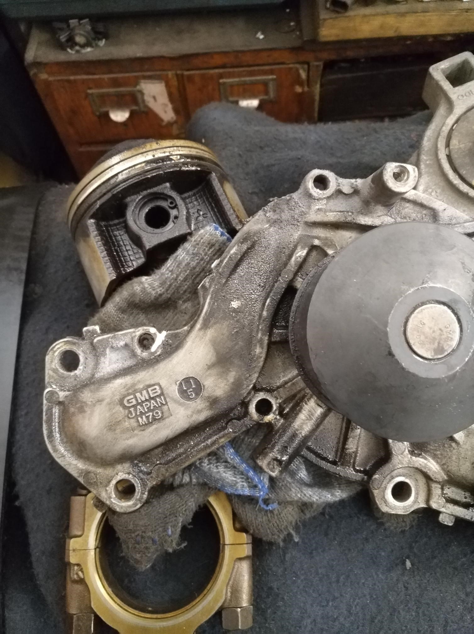 текло во все стороны и в развал блока и в ГРМ, но помпа в отличном состоянии! Сгнили нафиг картонные прокладки между всеми сопряжениями/половинками помпы! Помпа GMB у меня прошла 110000 км, по словам предыдущего владельца он менял ГРМ и помпу за 60000 до меня, поставили видимо картонные прокладки, которые были в комплекте, я когда перебирал ДВС снял всю помпу в сборе и неполовинил её, так и поставил обратно, в итоге за 170000 км пробега картонные прокладки превращаются в грязь!