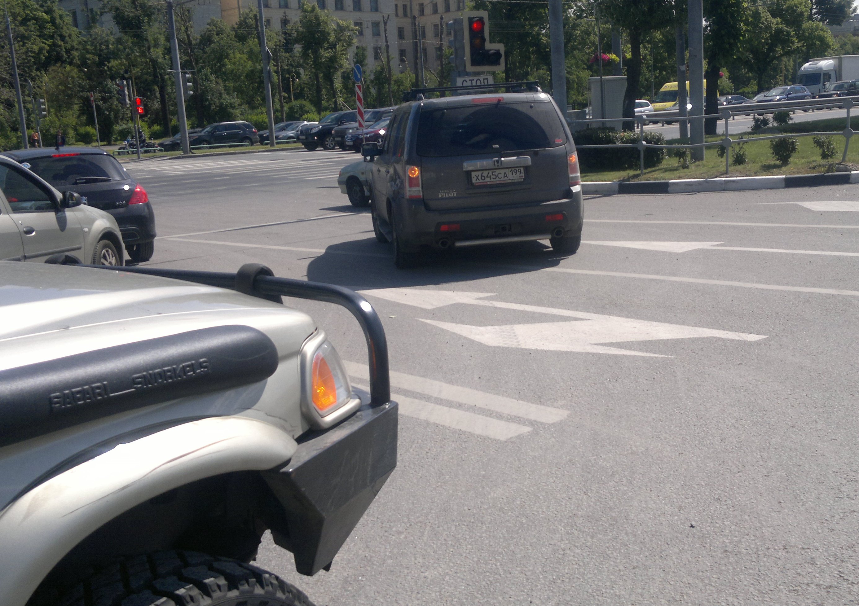 У меня на уголке бампера чуть-чуть содрана краска, у Хонды Пилот заднее крыло всмятку. Водила Хонды пытался убедить сотрудников ДПС в своей невиновности, но они быстро поставили его на место.