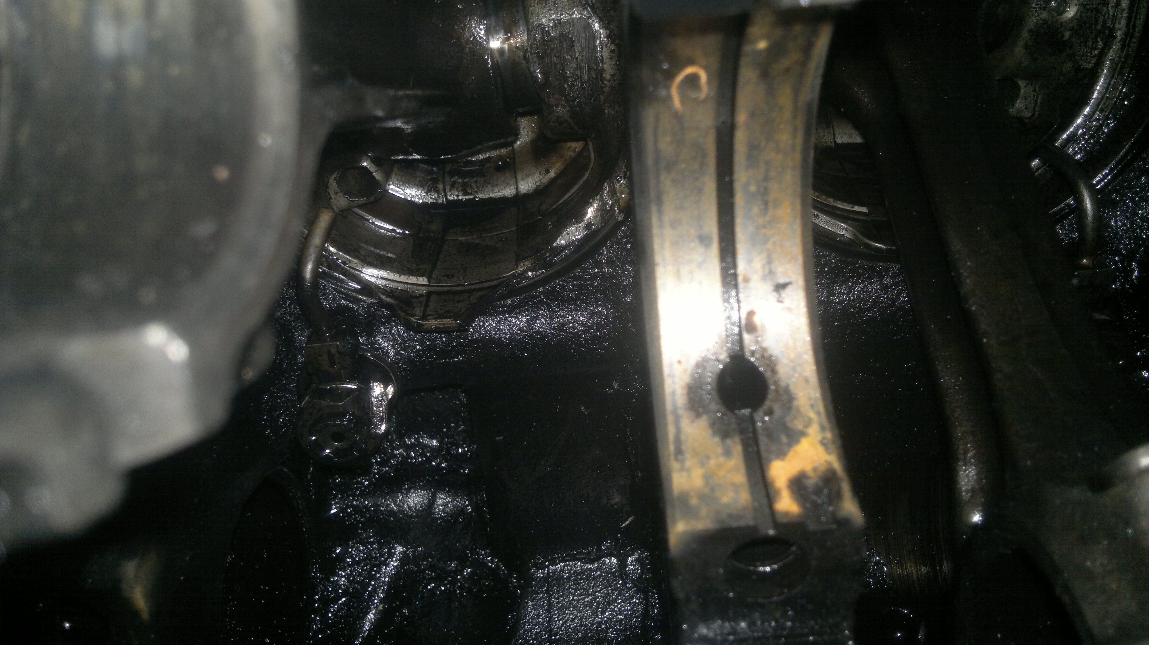 По прошествии 2х месяцев эксплуатации леденящий душу стук из под капота возвестил о начале новых «приключений»). Внешний осмотр и попытки поставить сколь-нибудь точный диагноз привели к «клину». Обзвон «надежных клиник» не радовал сроками начала лечения. Было принято решение вскрывать самостоятельно с подробным протоколированием процесса (и спецам будет проще восстановить события и самим собирать глядишь получится). По завершении ритуального танца с всевозможными трубочками, проводульками, датчиками, патрубками и прочими внутре-подкапотными жителями стемнело). К полудню дня второго «сердце мустанга» таки было извлечено и вскрыто. Сразу полез в поддон и вуаля первый шатунный вкладыш зверски провернут. И так диагноз поставлен - Голод. Впереди самое сложное – найти ответ на два извечных вопроса: Кто виноват? И что делать?