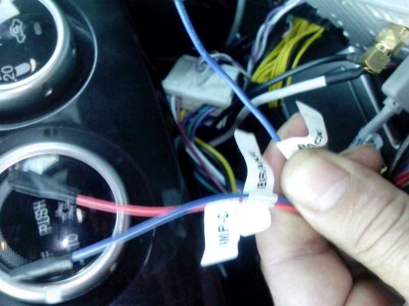 12.вытаскиваем магнитолу и на провод BACK прикручиваем 5метровый от камеры провод.см фото