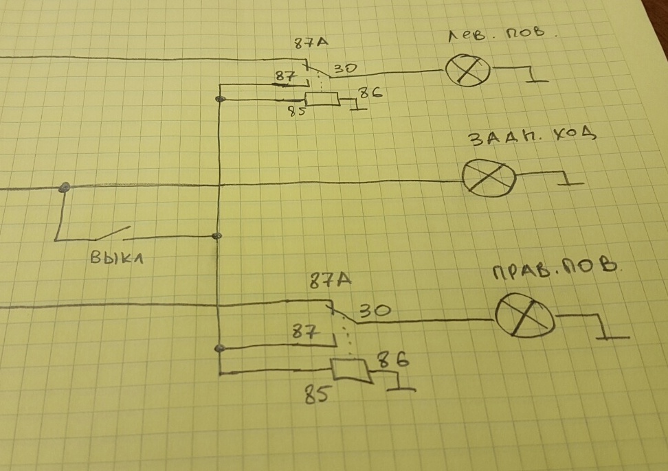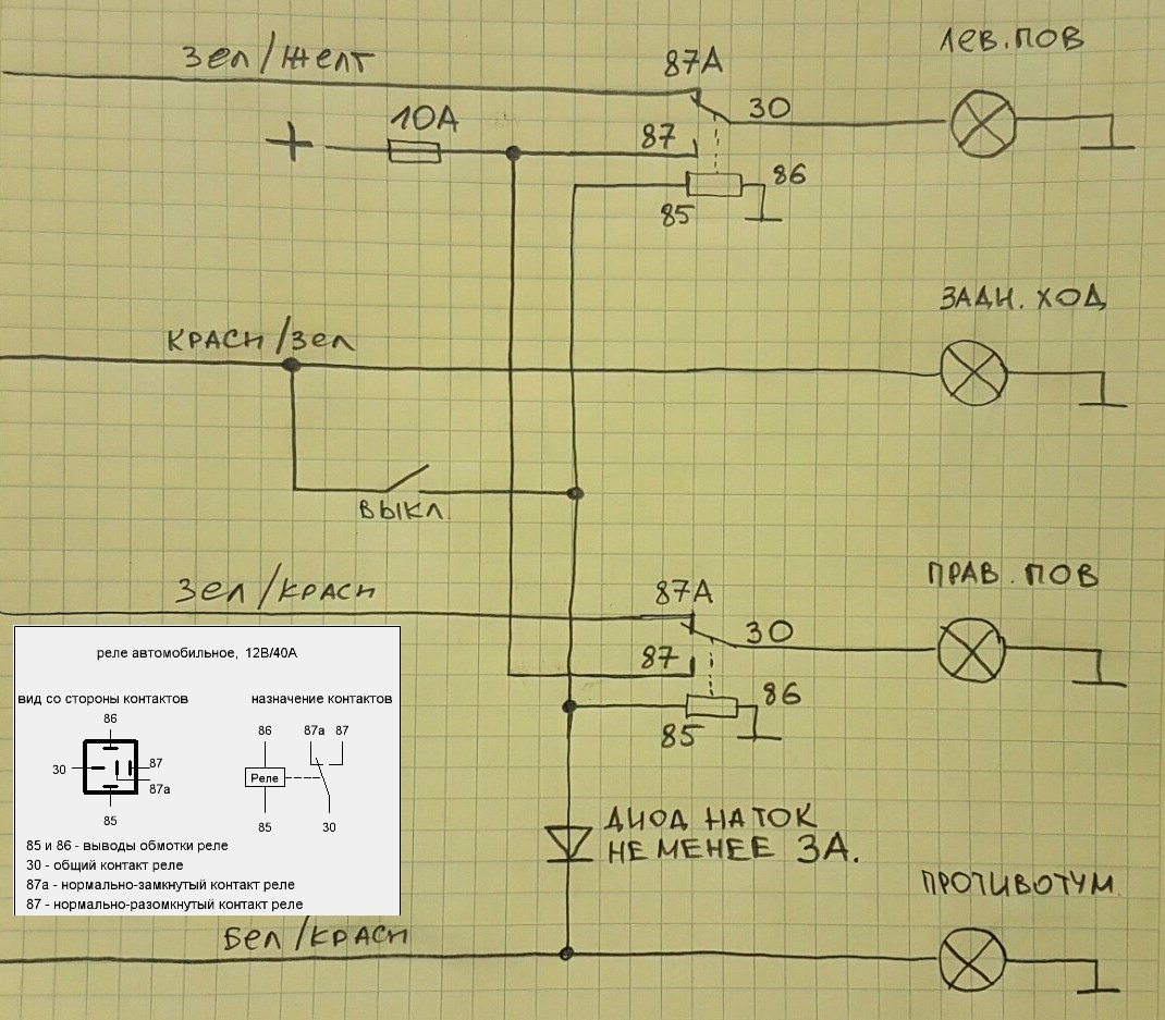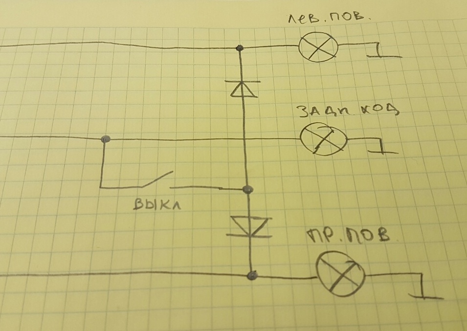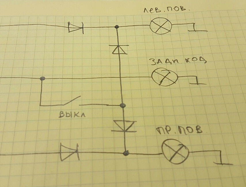 тут надо подумать; по первой прикидке получится, что выключателем придется работать каждый раз, когда нужен сильный задний свет. потому, что при включении этого выключателя в положение коммутации поступления тока от штатного заднего фонаря (т.е. по сигналу штатного включателя света заднего хода) поворотники работать не будут даже при движении вперед: раз нити ламп поворотников соеденены (понятно, параллельно), то подача прерывистого напряжения на поворотник от штатной системы вызовет такое же мигание и другого поворотника, а также мигания обеих ламп противотуманных габаритов.Евгеньич писал(а):Слушай, а интересная идея! Надо попробовать!Vovik113 писал(а):Может как вариант через выключатель сделать чтоб при включении заднего хода параллельно загорались задние поворотники? А выключатель чтоб при выключенном все работало штатно (для прохождения ТО или еще каких нибудь необходимостях)