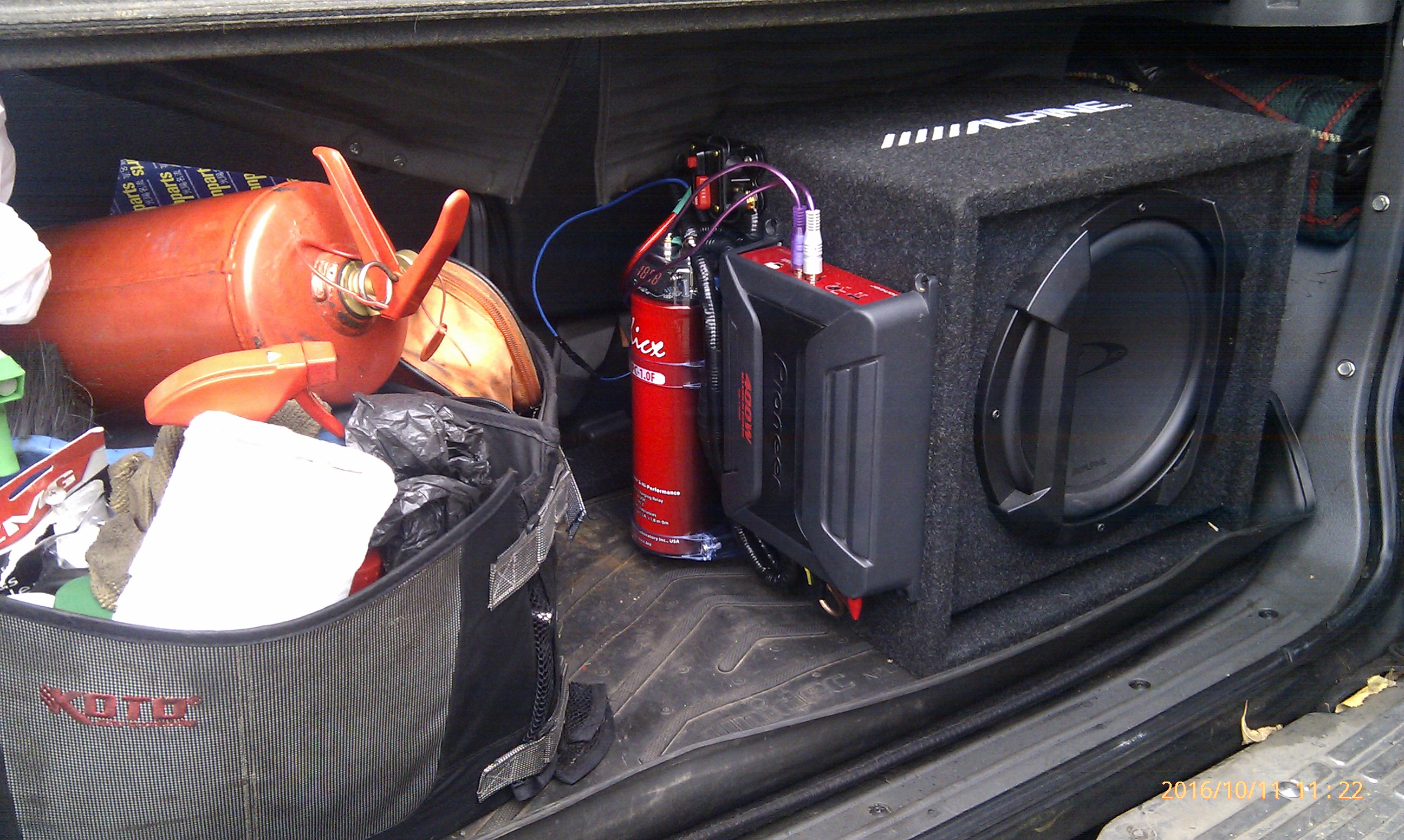 Я реализовал этот вариант установки плоской головы саба в 3(5) дверь. Голова Пионер 10", усь полк аудио моноблок ( в багажнике под поликом в пластиковом поддоне. И кондер там же)