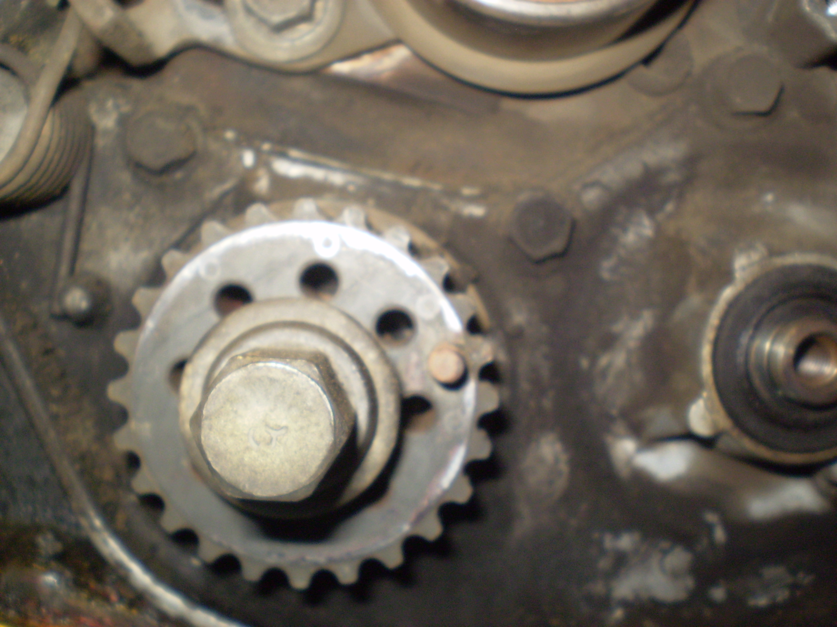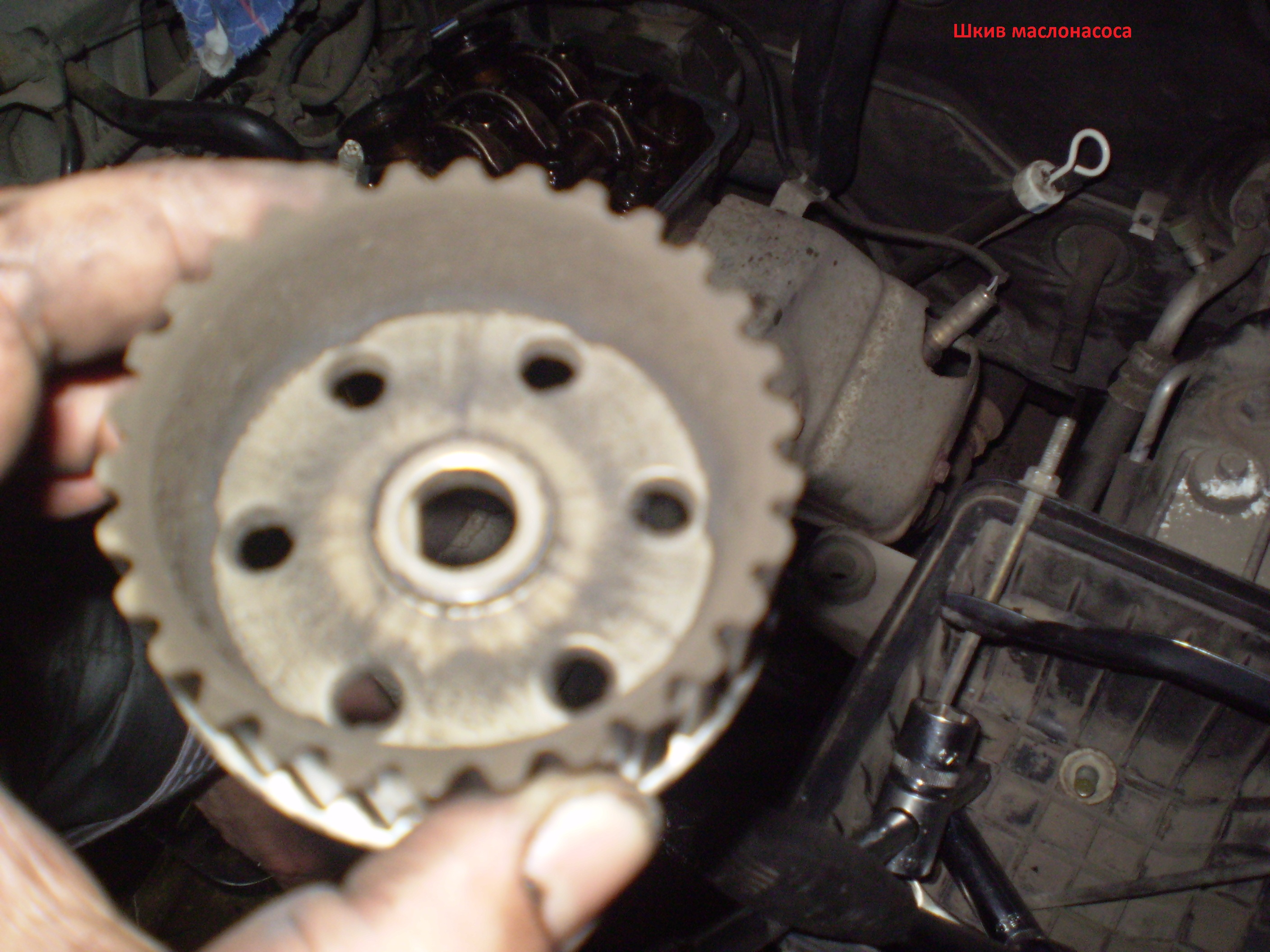 Зубчатый шкив маслонасоса откручивали таким образом: брали пассатижи-утконосы ( с длинными носиками), раздвигали почти до максимума, вставляли в смежные отверстия в шкиву , пассатижи удерживали газовым ключом, второй в это время накидным ключам откручивал гайку. Пытались найти спец инструмент ( съемник), на нашем рынке на нас как на идиотов смотрели, предлагали съемники шкивов клленвалов. А там инструмент то ( в мануале есть он кстати) простой, вилка с одним плавающим усиком, а на усиках перпендикулярно штырьки, которые и вставляются в технологические отверстия.