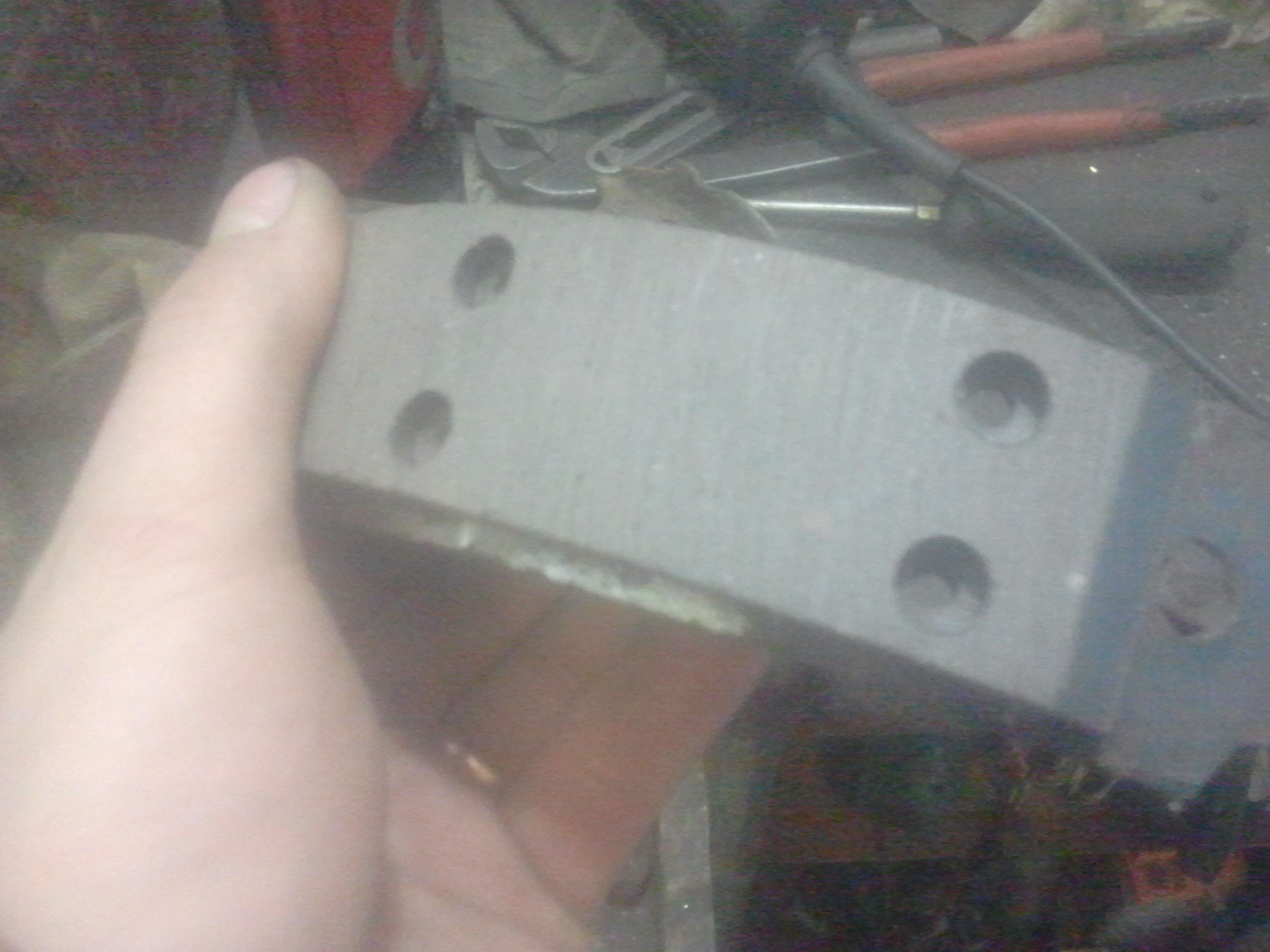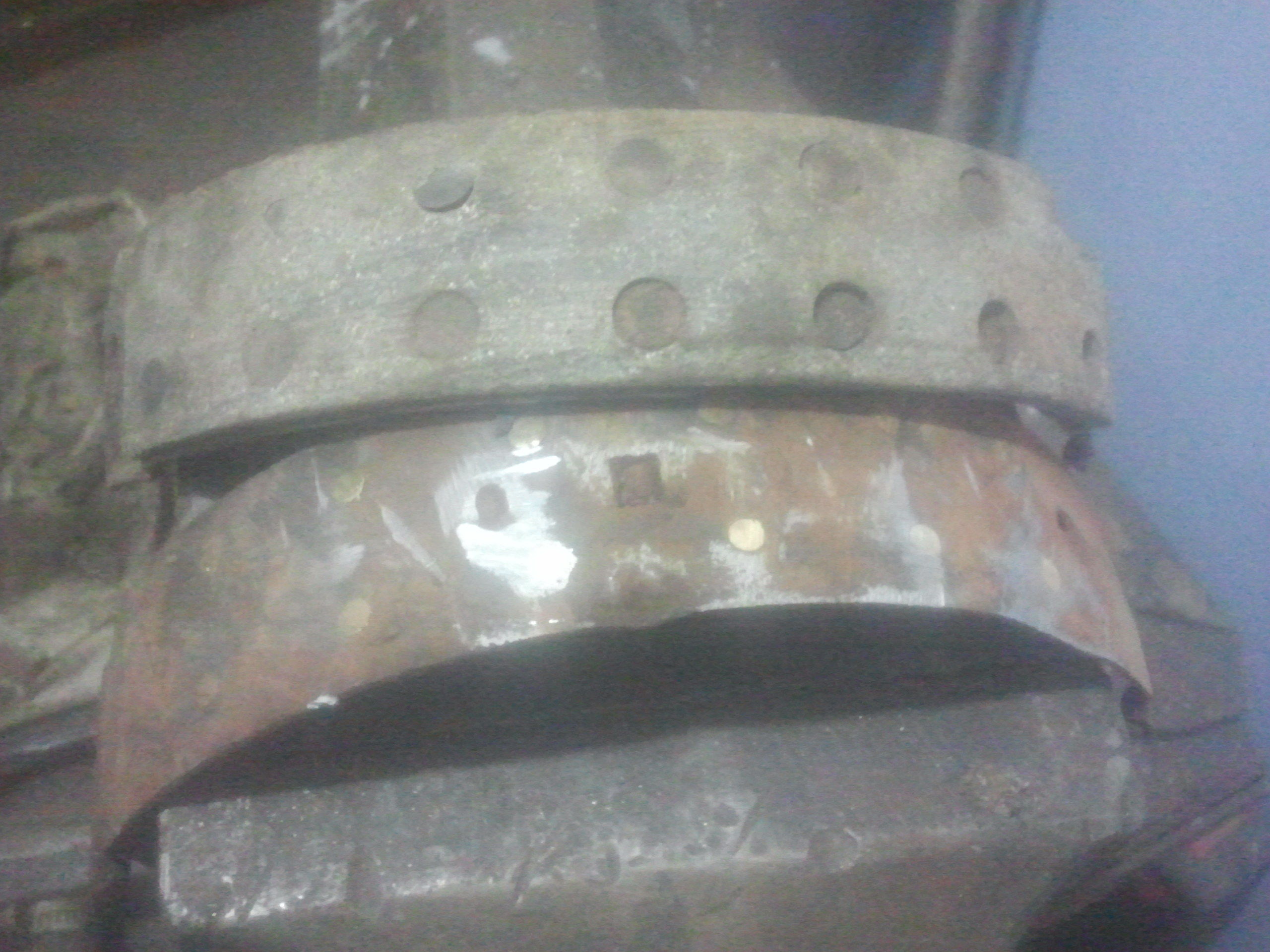 Дабы не плодить темы решил написать сюда.....как то мне интересно стало по поводу взаимозаменяемости запчастей на П2 решил проэксперементировать,и взялся за самое первое и важно ...это ручник......снял колодки на фото ниже их видно, в принципе они еще нормальные,снимаем старые накладки отверткой или зубильцем,а затем и клепки.....к стати у меня клепки были бронзовые,не знаю для чего они были сделаны из бронзы, но я думаю для того что бы колодки при стирании до нуля не портили стальную обойму где трутся колодки (бронза скользящий метал с минимальным стиранием)и снимаем см рычаг рызжима колодок (он у меня прикипел на одной староне)