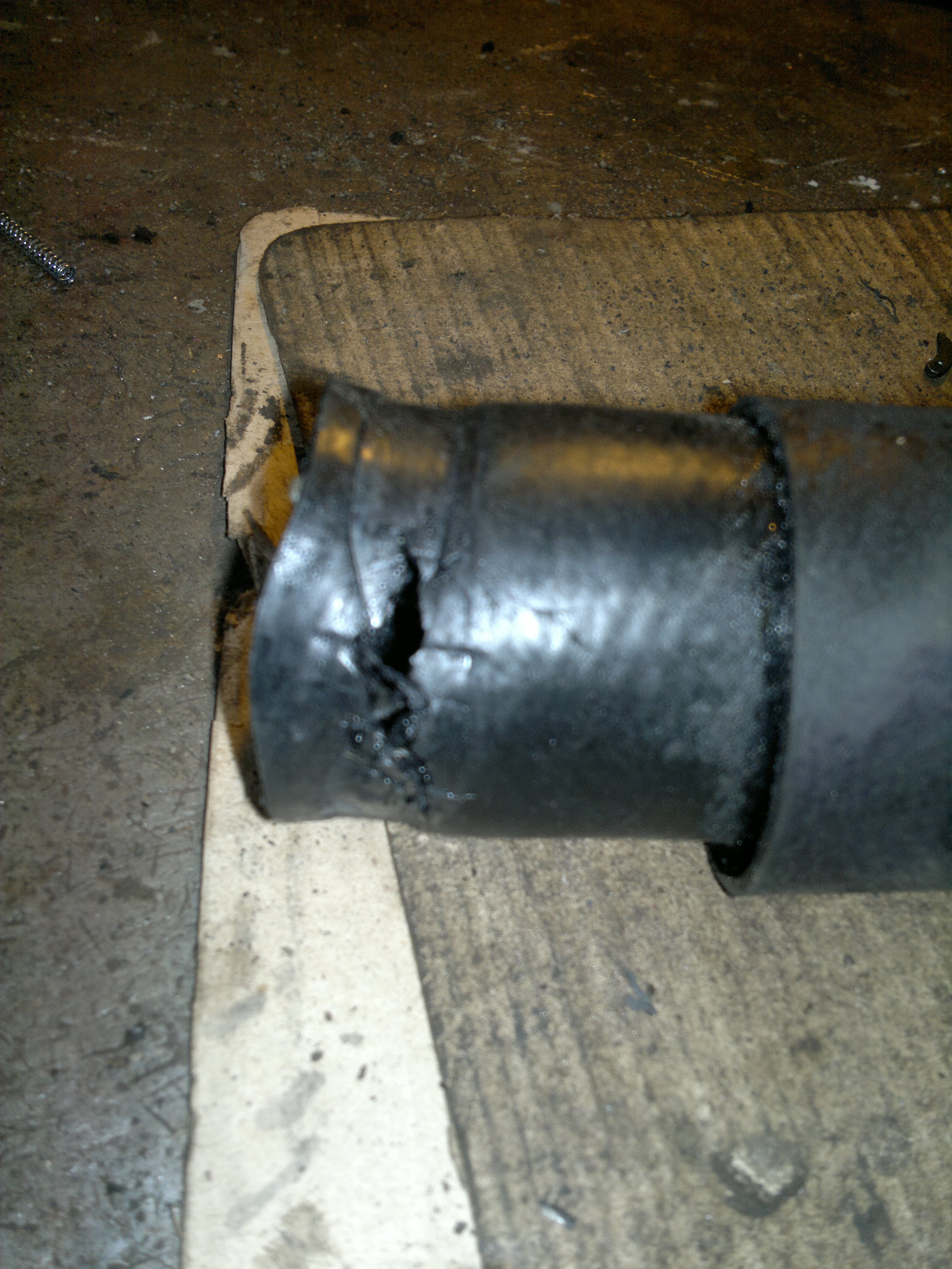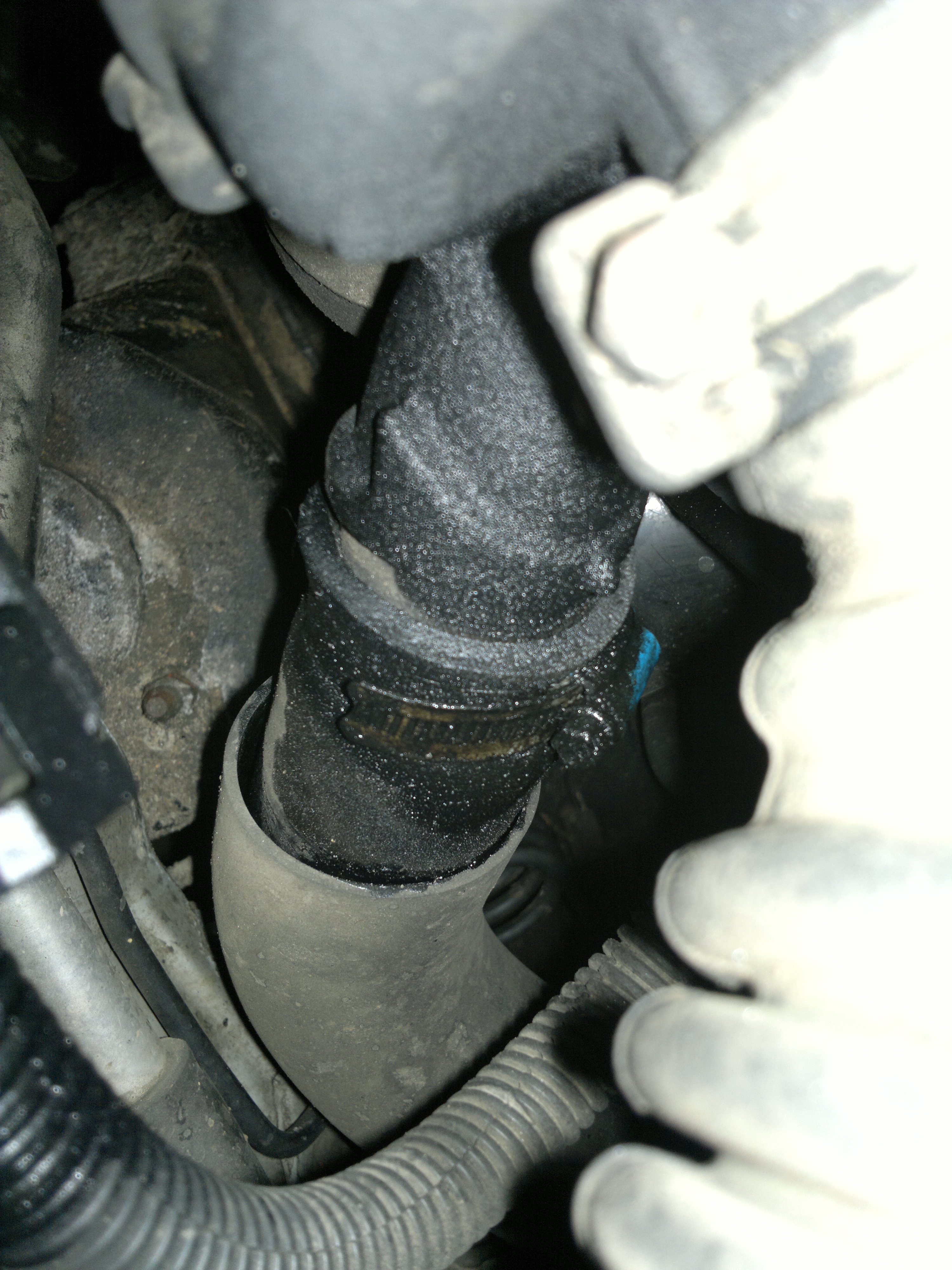 Разбор выявил вот такое повреждение патрубка в районе хомута:Армеец писал(а):Вот такая масляная кака образовалась в районе патрубка турбины и движка.