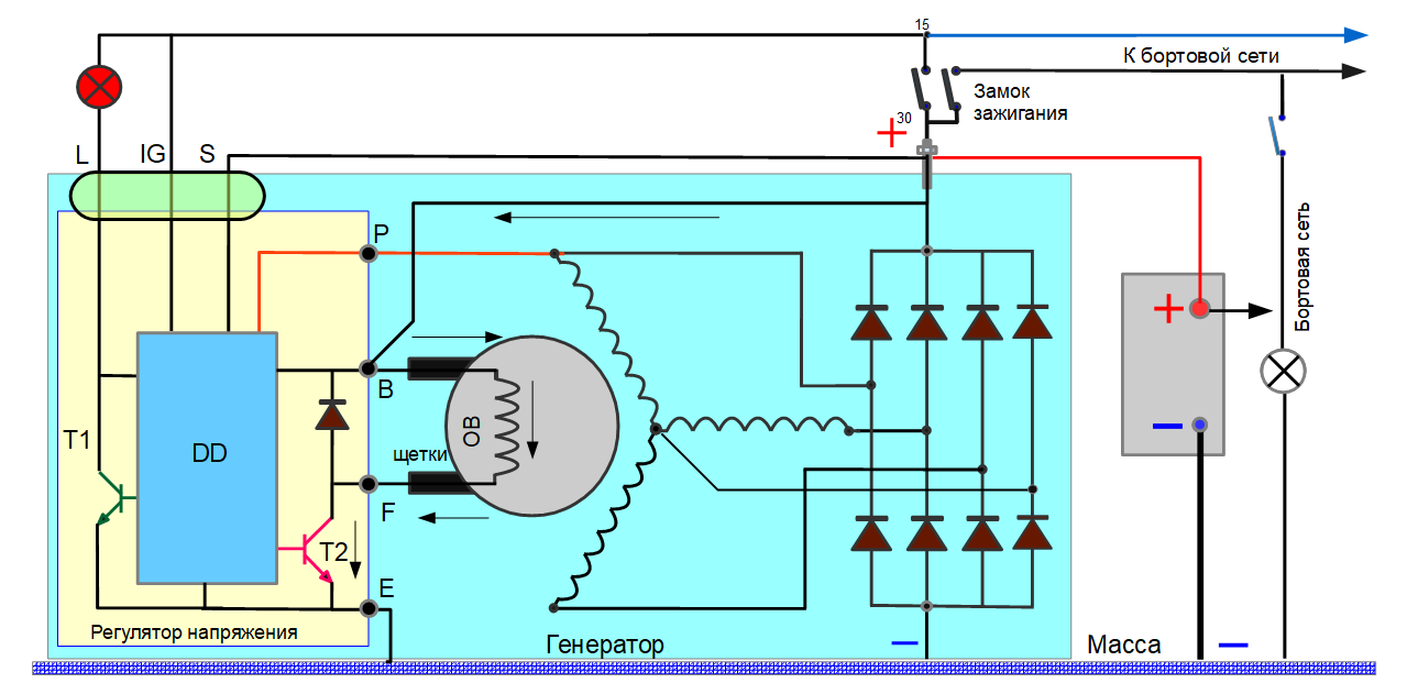 В выключенном состоянии к точке В подведен плюс от аккумулятора, но транзистор Т2 полностью закрыт и тока по цепи возбуждения нет. Плюс действует на точке S, но это вход с очень высоким сопротивлением и тока не потребляет.